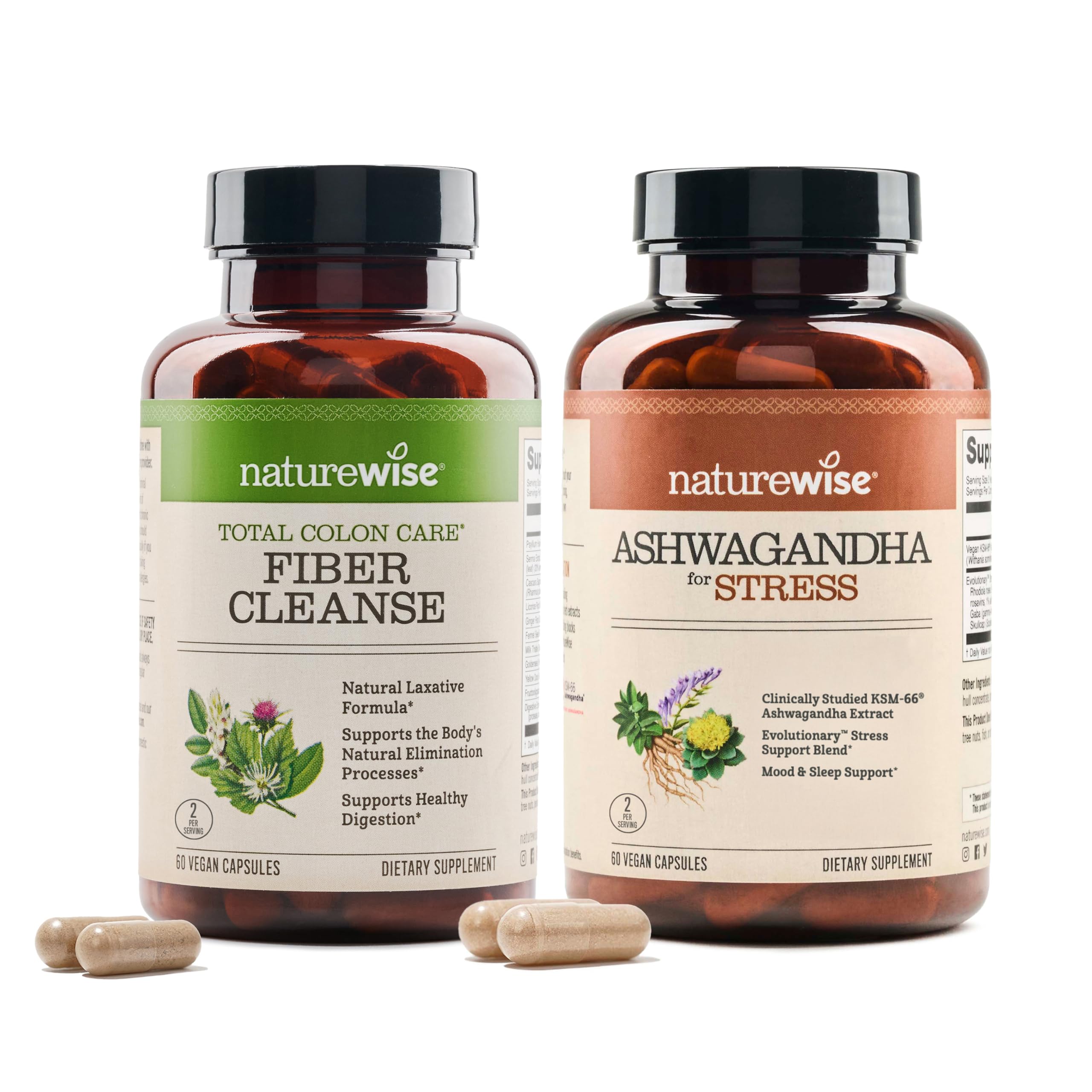 Total Colon Care lives up to its name: it is formulated for complete colon health support with prebiotics, bowel support ingredients, and antioxidants. This colon support supplement contains cascara sagrada extract, senna extract, turkey rhubarb, and triphala fruit which are used to support healthy bowel movements. Total Colon Care - Herbal Cleanse also contains inulin, a dietary plant-based fiber that serves as a prebiotic. This addition can further promote your gut health and encourage a balanced gut microbiome. NatureWise Total Colon Care - Herbal Cleanse includes peppermint leaf extract, chlorophyll, and aloe vera extract for added digestive support from herbal ingredients that are rich in antioxidant compounds. Support your digestive system and bowel function with NatureWise Total Colon Care - Herbal Cleanse. This product is vegan, gluten free, and does not contain wheat, gluten, eggs, soy, dairy, tree nuts, peanuts, fish, or shellfish. NatureWise Ashwagandha for Stress is a premium blend of studied herbs and nutrients designed to promote a healthy stress response and better sleep quality. Ashwagandha is an adaptogenic herb that has been shown in studies to support overall sleep quality, stress response, and mood. This supplement also features the Evolutionary Stress Support Blend which contains Rhodiola, L-Theanine, GABA, and Chinese Skullcap. Support yourself in times of stress with this blend of quality herbal ingredients curated for complete stress support. NatureWise Ashwagandha for Stress is vegan, gluten-free, and does not contain wheat, gluten, eggs, soy, dairy, tree nuts, peanuts, fish, or shellfish. Statements regarding dietary supplements have not been evaluated by the FDA and are not intended to diagnose, treat, cure, or prevent any disease or health condition.PREMIUM INGREDIENTS: These NatureWise supplements are manufactured in the USA with high-quality ingredients from around the world in a cGMP-certified facility with third-party quality control audits. NON-GMO, CLEAN INGREDIENTS: NatureWise products are exclusively formulated with clean, non-GMO ingredients for high-quality supplements you can feel good about. DELAYED-RELEASE CAPSULES: NatureWise Total Colon Care Fiber Cleanse uses delayed-release capsules, DRcaps, to protect ingredients from stomach acidity in order to deliver maximum benefits to the lower GI tract . L-THEANINE GABA: This stress-support formula contains L-Theanine and GABA, which are both supportive of sleep quality. . BOTANICALS PREBIOTICS: This natural laxative formula contains a unique blend of botanicals to soothe mucosal membranes in the large intestine and colon. Select prebiotics have been added to promote the growth of beneficial bacteria . RHODIOLA CHINESE SKULLCAP: Our Ashwagandha for Stress is formulated with rhodiola which is another adaptogenic herb, and Chinese Skullcap, which is rich in antioxidants. . SUPPORTS ELIMINATION: NatureWise Total Colon Care Fiber Cleanse encourages the elimination of waste, which may result in the shedding of excess pounds . KSM-66 ASHWAGANDHA: Every serving contains 600 mg of clinically studied KSM-66 Ashwagandha Root Extract, a high-concentration extract of this adaptogenic herb. NATURAL LAXATIVE FORMULA: NatureWise Total Colon Care Fiber Cleanse is a holistic blend of herbs and enzymes formulated to help cleanse the colon and promote healthy digestion and regularity .
