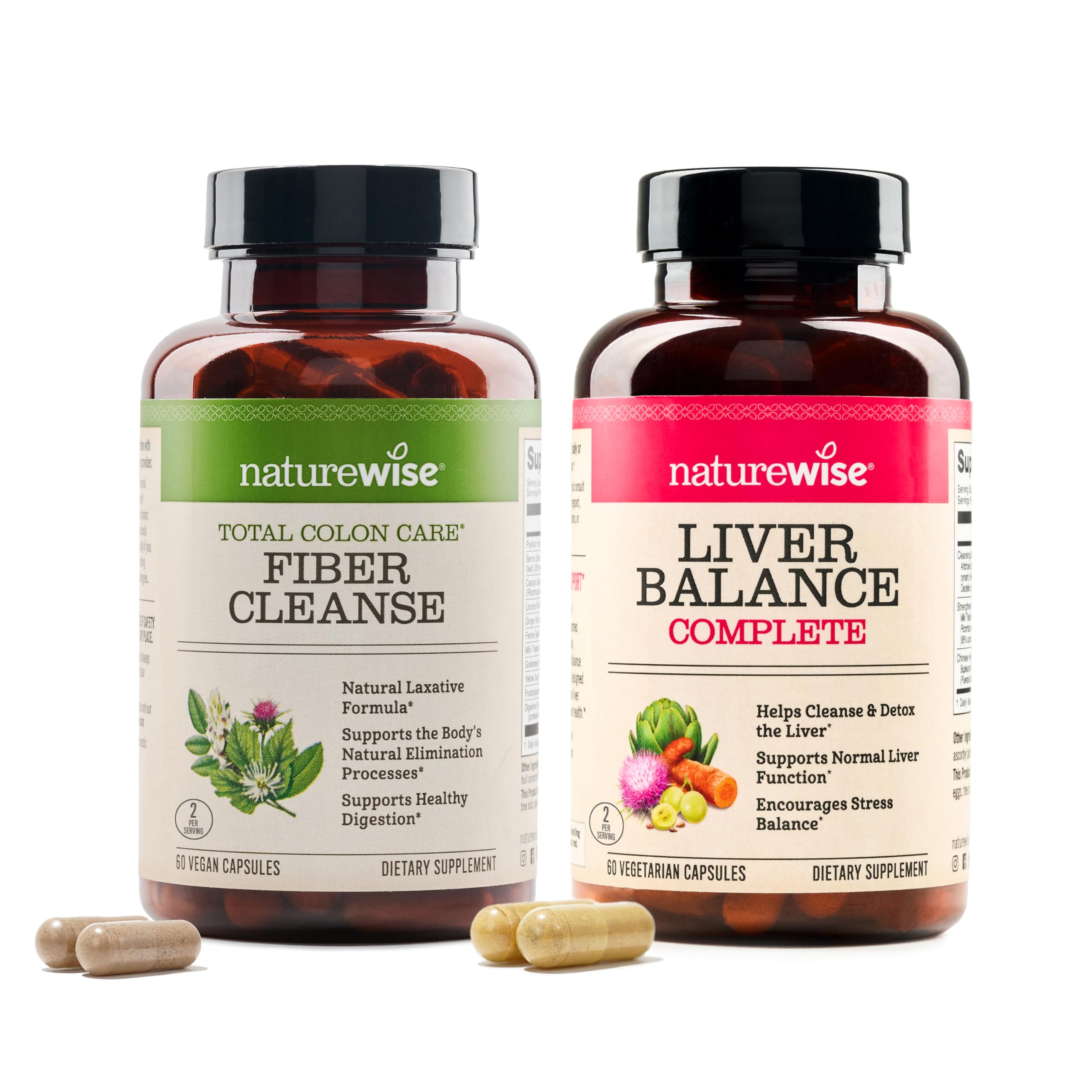 Total Colon Care lives up to its name: it is formulated for complete colon health support with prebiotics, bowel support ingredients, and antioxidants. This colon support supplement contains cascara sagrada extract, senna extract, turkey rhubarb, and triphala fruit which are used to support healthy bowel movements. Total Colon Care - Herbal Cleanse also contains inulin, a dietary plant-based fiber that serves as a prebiotic. This addition can further promote your gut health and encourage a balanced gut microbiome. NatureWise Total Colon Care - Herbal Cleanse includes peppermint leaf extract, chlorophyll, and aloe vera extract for added digestive support from herbal ingredients that are rich in antioxidant compounds. Support your digestive system and bowel function with NatureWise Total Colon Care - Herbal Cleanse. This product is vegan, gluten free, and does not contain wheat, gluten, eggs, soy, dairy, tree nuts, peanuts, fish, or shellfish. Support Your Liver health with NatureWise Liver Balance for a refreshing liver cleanse. NatureWise Liver Balance Complete is a comprehensive liver health supplement that helps cleanse your liver and support liver function for long-term health. It includes science-backed, time-tested liver herbs that help support liver function no matter the stresses of modern life. Take 2 vegetarian softgels daily or as needed to support your liver health. NatureWise Liver Balance Complete is non-GMO, gluten-free does not contain wheat, gluten, dairy, soy, eggs, tree nuts, peanuts, fish or shellfish.CLEAN INGREDIENTS: These NatureWise supplements are non-GMO with no artificial excipients or fillers. These vegetarian capsules are gluten free, soy free, dairy free. NON-GMO, CLEAN INGREDIENTS: NatureWise products are exclusively formulated with clean, non-GMO ingredients for high-quality supplements you can feel good about. ADVANCED LIVER CARE SUPPORT: Traditional Chinese herbs like bupleurum, kudzu root, and peony help support normal, healthy liver function. . DELAYED-RELEASE CAPSULES: NatureWise Total Colon Care Fiber Cleanse uses delayed-release capsules, DRcaps, to protect ingredients from stomach acidity in order to deliver maximum benefits to the lower GI tract . LIVER FUNCTION SUPPORT: Our premium liver health formula includes powerful antioxidant herbs like 80 silymarin milk thistle extract, 95 curcuminoids turmeric root extract, to help support healthy liver function. . BOTANICALS PREBIOTICS: This natural laxative formula contains a unique blend of botanicals to soothe mucosal membranes in the large intestine and colon. Select prebiotics have been added to promote the growth of beneficial bacteria . HERBAL CLEANSE: Our liver cleanse supplement includes potent herbal extracts like artichoke, reishi and dandelion to help support cleansing the liver . SUPPORTS ELIMINATION: NatureWise Total Colon Care Fiber Cleanse encourages the elimination of waste, which may result in the shedding of excess pounds . TRIPLE LIVER SUPPORT SUPPLEMENT: NatureWise Liver Balance Complete is a comprehensive liver support formula that includes 3 targeted herbal blends to help cleanse and support the liver. . NATURAL LAXATIVE FORMULA: NatureWise Total Colon Care Fiber Cleanse is a holistic blend of herbs and enzymes formulated to help cleanse the colon and promote healthy digestion and regularity .