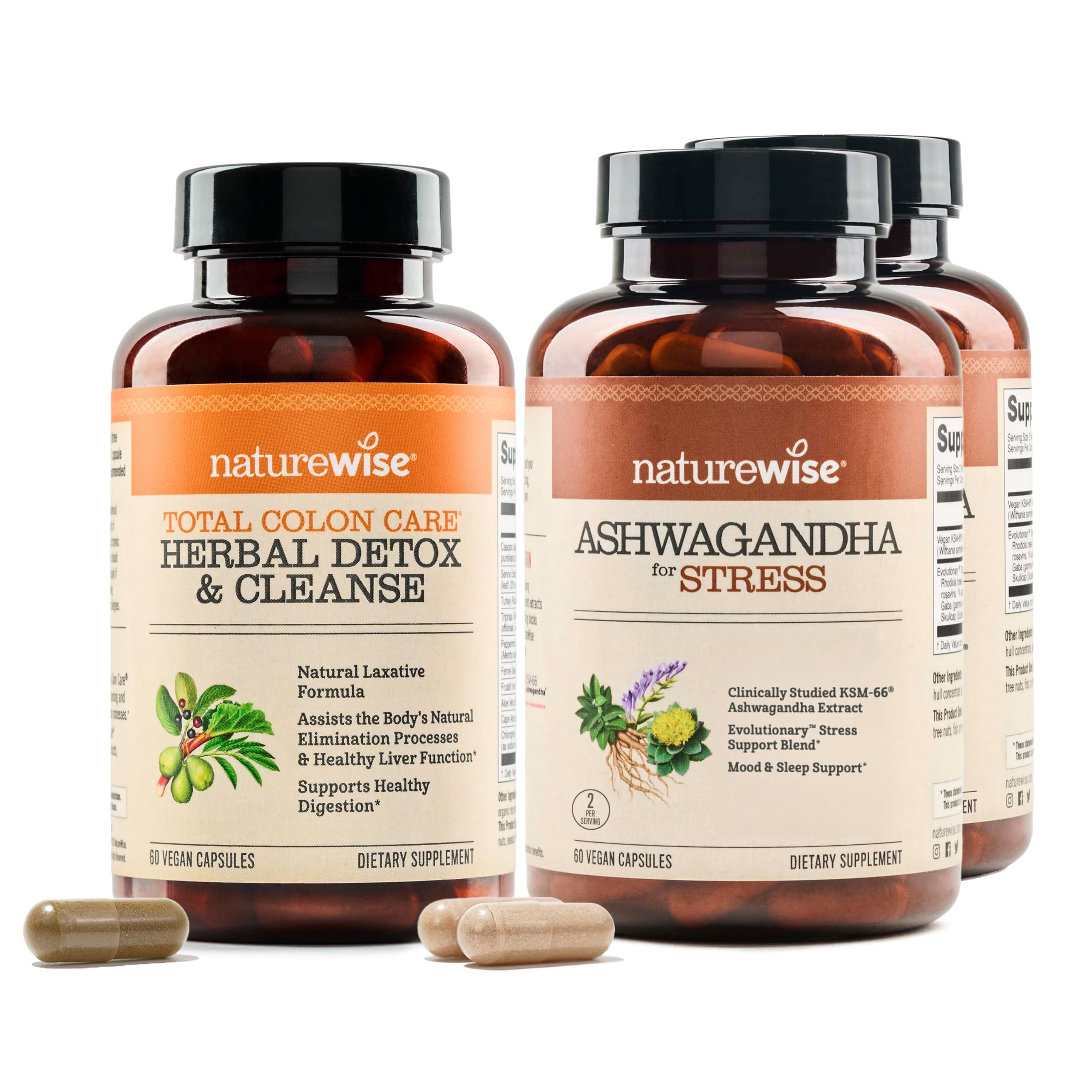 Total Colon Care lives up to its name: it is formulated for complete colon health support with prebiotics, bowel support ingredients, and antioxidants. This colon support supplement contains cascara sagrada extract, senna extract, turkey rhubarb, and triphala fruit which are used to support healthy bowel movements. Total Colon Care - Herbal Cleanse also contains inulin, a dietary plant-based fiber that serves as a prebiotic. This addition can further promote your gut health and encourage a balanced gut microbiome. NatureWise Total Colon Care - Herbal Cleanse includes peppermint leaf extract, chlorophyll, and aloe vera extract for added digestive support from herbal ingredients that are rich in antioxidant compounds. Support your digestive system and bowel function with NatureWise Total Colon Care - Herbal Cleanse. This product is vegan, gluten free, and does not contain wheat, gluten, eggs, soy, dairy, tree nuts, peanuts, fish, or shellfish. NatureWise Ashwagandha for Stress is a premium blend of studied herbs and nutrients designed to promote a healthy stress response and better sleep quality. Ashwagandha is an adaptogenic herb that has been shown in studies to support overall sleep quality, stress response, and mood. This supplement also features the Evolutionary Stress Support Blend which contains Rhodiola, L-Theanine, GABA, and Chinese Skullcap. Support yourself in times of stress with this blend of quality herbal ingredients curated for complete stress support. NatureWise Ashwagandha for Stress is vegan, gluten-free, and does not contain wheat, gluten, eggs, soy, dairy, tree nuts, peanuts, fish, or shellfish. Statements regarding dietary supplements have not been evaluated by the FDA and are not intended to diagnose, treat, cure, or prevent any disease or health condition.PREMIUM INGREDIENTS: These NatureWise supplements are manufactured in the USA with high-quality ingredients from around the world in a cGMP-certified facility with third-party quality control audits. NON-GMO, VEGAN: These NatureWise supplements are vegan, and do not contain wheat, gluten, eggs, soy, dairy, tree nuts, peanuts, fish, or shellfish. L-THEANINE GABA: This stress-support formula contains L-Theanine and GABA, which are both supportive of sleep quality. . MADE TO SURVIVE: This supplement comes in delayed-release capsules so that these gut-healthy ingredients survive harsh stomach acids and get right to where they're most needed in the gut. RHODIOLA CHINESE SKULLCAP: Our Ashwagandha for Stress is formulated with rhodiola which is another adaptogenic herb, and Chinese Skullcap, which is rich in antioxidants. . PREBIOTICS BOTANCIALS: Herbs like turkey rhubarb, peppermint leaf, cascara sagrada extract and fennel seed, plus prebiotic fiber may improve digestive health. . KSM-66 ASHWAGANDHA: Every serving contains 600 mg of clinically studied KSM-66 Ashwagandha Root Extract, a high-concentration extract of this adaptogenic herb. BOWEL MOVEMENT SUPPORT: This advanced colon cleanse formula contains herbs like senna, chlorophyll, triphala, and aloe vera plus chicory root fiber to gently support bowel regularity. .