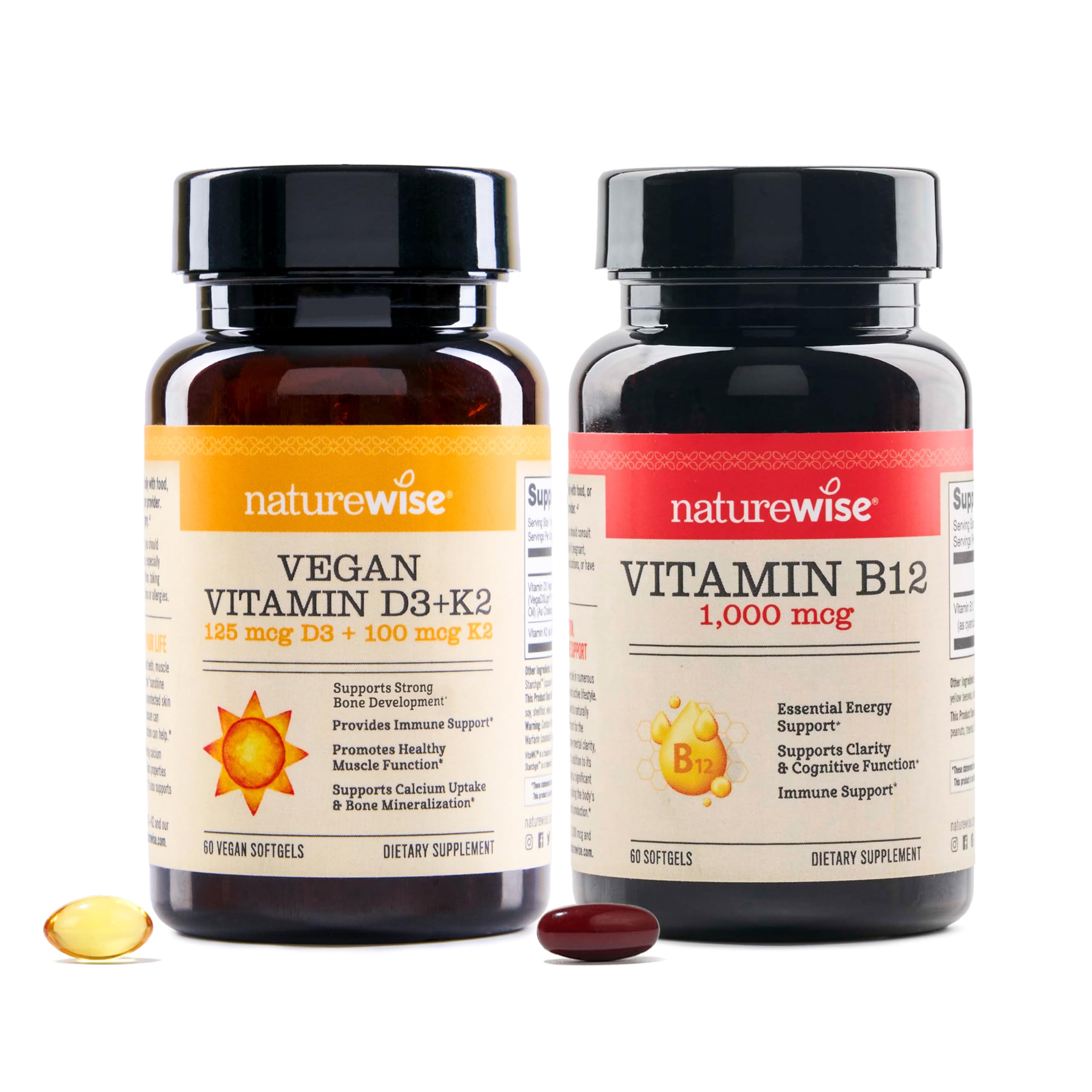 Vitamin D3 and K2 complement each other well, working together to support various physiological functions and promote overall health. Vitamin D3, also known as cholecalciferol, plays a role in calcium absorption and bone health. It facilitates the absorption of calcium and phosphorus from the intestine, which is important for maintaining strong bones. Most D3 is sourced from animal products, but our supplement uses plant-based vitamin D3 from lichen to meet your dietary restrictions. Conversely, vitamin K2, or menaquinone, is primarily recognized for its important role in heart health and calcium distribution in the body. Vitamin K directs calcium to where it's needed, especially the bones. Taking vitamin D3 and K2 together can be very effective for immune support and bone health. Pick NatureWise to support your bone health and immune health efficiently with clean, premium ingredients. Vitamin B12 is an important nutrient that plays a crucial role in maintaining healthy nerve function, energy production, and mental clarity. A vitamin B12 deficiency can result in low levels of energy throughout the day. If you're looking to support your energy levels and promote mental clarity, these softgels are your perfect daily companion. Our high-potency formula contains 1000 mcg of vitamin B12 in every softgel, so you can support your nervous system on the go. Trust in NatureWise's commitment to quality, as our Vitamin B12 softgels are non-GMO, gluten-free, and third-party tested for purity. Our product does not contain gluten, wheat, soy, dairy, eggs, peanuts, tree nuts, fish, or shellfish.CLEAN, NON-GMO: These NatureWise supplements are non-GMO, gluten-free, and does not contain wheat, eggs, soy, dairy, tree nuts, peanuts, fish, or shellfish. SUPERIOR FORMULATION WITH HALAL GELATIN: NatureWise Vitamin B12 softgels have no artificial colors, synthetic dyes, flavors, or GMOs, and they are made with halal gelatin. They are free of gluten, wheat, soy, dairy, eggs, peanuts, tree nuts, fish, or shellfish. BRAIN NERVE HEALTH SUPPORT: Vitamin B12 may support your cognitive function due to its important role in the nervous system. B12 contributes to the body's production of neurotransmitters, which affect clarity, mood, and memory. . ORGANIC COLD-PRESSED OLIVE OIL: NatureWise Vegan Vitamin D3 K2 is formulated with organic, cold-pressed olive oil that doesn't use heat or hexanes, to enhance the absorption of vitamin D3. . CARDIOVASCULAR HEALTH: Vitamin B12 is important for cardiovascular health, function, and balance in homocysteine levels. . NATURAL, CLINICALLY STUDIED VITAMIN K2: VitaMK7 is a natural source of Vitamin K2 that is clinically studied in supporting bone formation, while also supporting cardiovascular health. . ENERGY METABOLISM SUPPORT: Every easy-to-swallow softgel delivers 1000 mcg of Vitamin B12 to support the production of cellular energy and help convert food into energy. . ORGANIC VEGAN VITAMIN D3: Our Vegan Vitamin D3 is from VegaDelight, a Organic D3 from sustainably sourced Lichen, an algae that produces a natural, vegan and bioavailable vitamin D3.