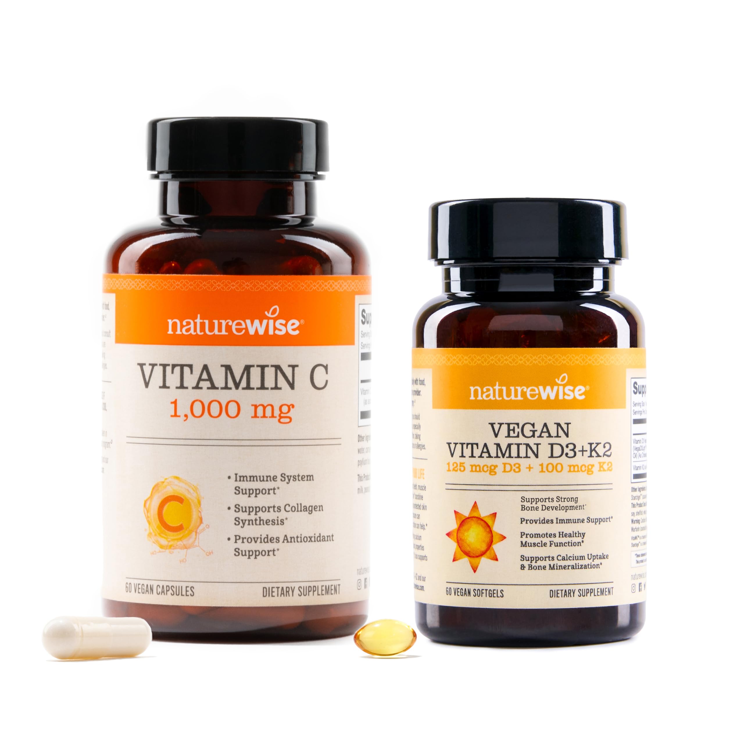 NatureWise Vitamin C 1000mg Capsules are a dietary supplement that supports immune health, provides antioxidant support, and supports collagen synthesis. Sourced from high-quality ingredients, these gluten-free Vitamin C 1000mg capsules are packed with antioxidants for immune strength. Vitamin C is an antioxidant that helps support your immune system and is also needed for collagen synthesis to support overall skin health. One vitamin C capsule delivers a potent dose of 1,000 mg of vitamin C or 1,111 of your daily intake. NatureWise Vitamin C 1000mg Capsules are vegan, gluten-free, and third-party tested for purity and potency. This vitamin C does not contain wheat, gluten, dairy, eggs, soy, milk, tree nuts, peanuts, fish, shellfish, or sesame. Vitamin D3 and K2 complement each other well, working together to support various physiological functions and promote overall health. Vitamin D3, also known as cholecalciferol, plays a role in calcium absorption and bone health. It facilitates the absorption of calcium and phosphorus from the intestine, which is important for maintaining strong bones. Most D3 is sourced from animal products, but our supplement uses plant-based vitamin D3 from lichen to meet your dietary restrictions. Conversely, vitamin K2, or menaquinone, is primarily recognized for its important role in heart health and calcium distribution in the body. Vitamin K directs calcium to where it's needed, especially the bones. Taking vitamin D3 and K2 together can be very effective for immune support and bone health. Pick NatureWise to support your bone health and immune health efficiently with clean, premium ingredients.VEGAN NON-GMO: These NatureWise supplements are vegan, non-GMO, and gluten free. These premium supplements do not contain wheat, gluten, dairy, eggs, soy, milk, tree nuts, peanuts, fish, shellfish, or sesame. ONE-PER-DAY FORMULA: Adults take one vegan vitamin c 1000mg capsule a day with food and water to get 1000mg of vitamin C. ORGANIC COLD-PRESSED OLIVE OIL: NatureWise Vegan Vitamin D3 K2 is formulated with organic, cold-pressed olive oil that doesn't use heat or hexanes, to enhance the absorption of vitamin D3. . COLLAGEN SYNTHESIS SUPPORT: Vitamin C helps support collagen synthesis for optimal skin health and appearance. . NATURAL, CLINICALLY STUDIED VITAMIN K2: VitaMK7 is a natural source of Vitamin K2 that is clinically studied in supporting bone formation, while also supporting cardiovascular health. . IMMUNE ANTIOXIDANT SUPPORT: Vitamin C is an important antioxidant for immune health and function, as well as collagen synthesis in the body. . ORGANIC VEGAN VITAMIN D3: Our Vegan Vitamin D3 is from VegaDelight, a Organic D3 from sustainably sourced Lichen, an algae that produces a natural, vegan and bioavailable vitamin D3. EXTRA STRENGTH DOSE: NatureWise Vitamin C 1000mg Capsules deliver 1000mg of Vitamin C per capsule, providing antioxidant and immune system support. .