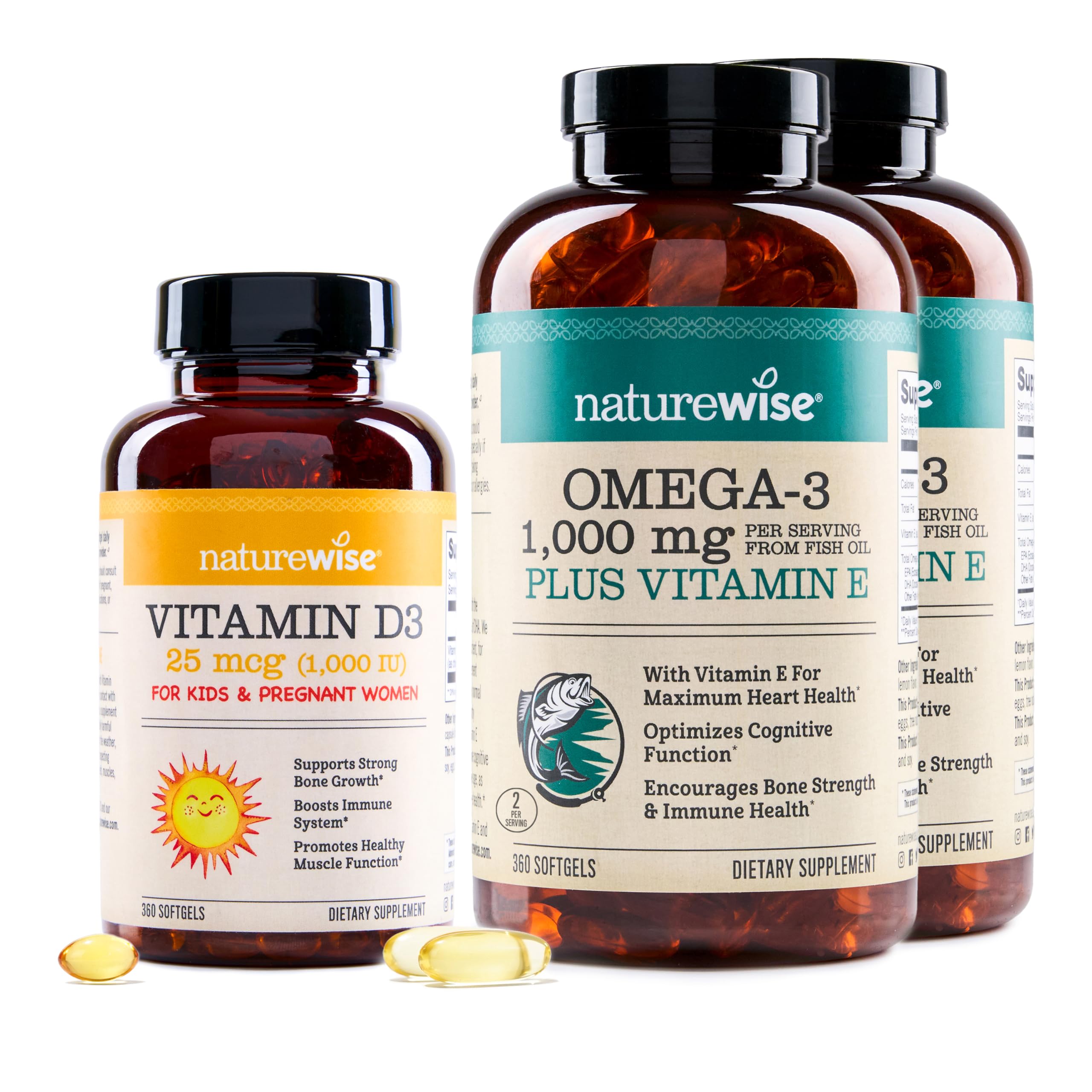 The Sunshine Vitamin - Vitamin D can be found in cells throughout the entire body. It is important for calcium and phosphorus absorption, which may help build and maintain strong bones and teeth, provide immune system support, and for healthy muscle function. Since Vitamin D is fat-soluble, we include certified organic olive oil as a healthy fat source for better absorption. NatureWise supplements are proudly manufactured in USA-based facilities that comply with the strictest cGMP standards and are carefully tested by third-party laboratories for purity and potency, as well as physical and chemical contamination, guaranteeing the highest standards of quality and safety. Every serving of this omega 3 supplement provides 1060 mg of Omega 3 fatty acids with the added benefits of vitamin E. Why take omega 3 fish oil with vitamin E? Because this dynamic duo works together to support your overall heart health, as well as your eye health. Omega 3 fatty acids also support overall joint health, comfort, and flexibility. Our Omega 3 supplement is made with premium omega 3 fish oils with the optimal dose of 600 mg EPA and 400 mg DHA fatty acids, and 60 mg of other fatty acids, so your body gets support for your overall heart, brain, joint, and eye health. NatureWise Omega 3 softgels are gluten-free and non-GMO. These softgels do not contain wheat, gluten, eggs, dairy, peanuts, tree nuts, and corn. This product contains fish (anchovy, mackerel, sardine) and soy. Statements regarding dietary supplements have not been evaluated by the FDA and are not intended to diagnose, treat, cure, or prevent any disease or health condition.GLUTEN-FREE, GMO-FREE: These NatureWise supplements are gluten-free and GMO-free.These softgels do not contain wheat, gluten, eggs, dairy, peanuts, tree nuts, and corn. This product contains fish (anchovy, mackerel, sardine) and soy. UNCOMPROMISING QUALITY: All NatureWise supplements are Manufactured in USA-based facilities that comply to the strictest cGMP standards and undergo rigorous testing by third party labs to ensure the highest quality and purity. NO FISHY BURPS OR SMELLS: Unlike other brands, NatureWise Omega-3 softgels deliver omega-3 fish oil without the fishy smells or fishy burps that other fish oil supplements have. PURE NATURAL: These Vitamin D3 immune support and bone health supplements are gluten-free and non-GMO. Third party tested for purity and potency. Packaging may vary due to high demand, same great product and ingredients. SUNSHINE IN A BOTTLE: The Vitamin D Council recommends daily vitamin D supplementation for most adults to achieve and maintain optimal levels, regardless of weather or season. NatureWise Vitamin D3 is all natural, non-GMO, and gluten free with no artificial additives, fillers or binders. PURIFIED OF HEAVY METALS: We distill our high-quality fish oil from heavy metals such as mercury, leaving behind only beneficial components of the fish oil. RECOMMENDED DOSE FOR KIDS MOMS: 1000IU is the recommended amount of vitamin D3 for growing children and expecting mothers, but our product is intended to safely encourage calcium absorption and immune system strength in any user. EXTRA STRENGTH OMEGA-3 VITAMIN E: Omega 3 is an essential fatty acid, while vitamin E is a fat-soluble vitamin that is protective of omega 3 fatty acids. We combined omega 3 fish oil with vitamin E so that these synergistic compounds can support overall heart, brain, joint, and eye health. . A VITAL NUTRIENT: Vitamin D supports healthy bones, teeth, muscle function, and a strong immune system. Many people may be deficient in this nutrient, making it even more important for overall health. .
