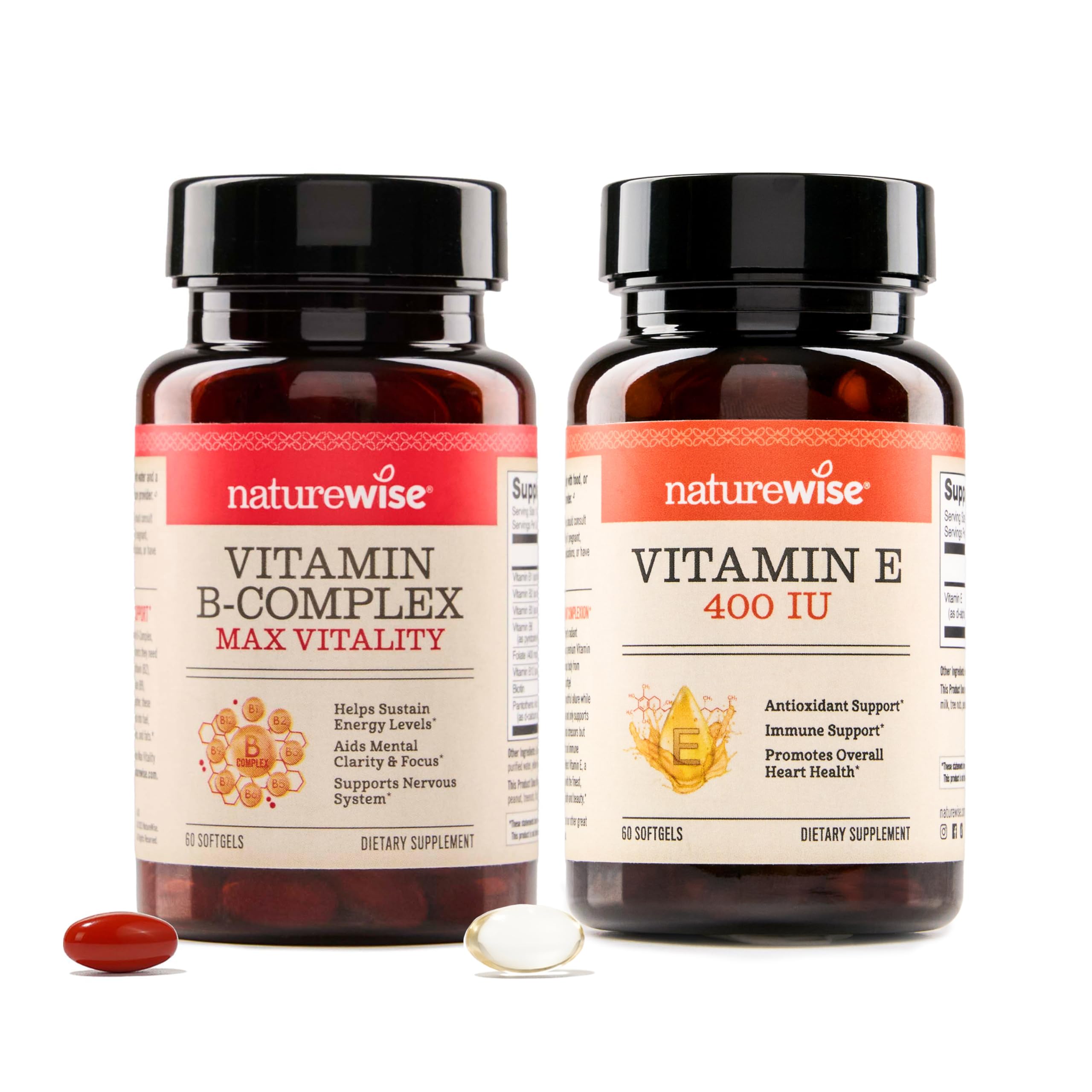 Our Vitamin B Complex supplement contains a comprehensive array of B vitamins, including B1, B2, B3, B6, biotin (B7), folic acid (B9), and B12. We wanted to provide comprehensive support for your cellular energy production processes, as well as your energy levels throughout the day. Folic acid is an important B vitamin that is beneficial for hair health and for the development of the fetus for pregnant persons. Biotin is also a great addition that supports the health of your hair, skin, and nails. These B vitamins serve as coenzymes, facilitating enzymatic reactions that drive the conversion of macronutrients into usable energy. Through this mechanism, vitamin B ensures the efficient utilization of carbohydrates, proteins, and fats derived from the diet, thereby supporting overall energy levels. Naturewise Vitamin E contains 180mg or 400 IU of vitamin E in every softgel. Vitamin E is supportive of a variety of functions and mechanisms in your body. It supports your overall immune health and function by supporting your immune system's defense mechanisms. Vitamin E is also known for its ability to support the skin, contributing to healthy aging. Incorporating this Vitamin E supplement into your daily routine alongside your regular skincare regimen can significantly enhance your skin health and appearance from within. Moreover, Vitamin E may support eye health and vision. NatureWise supplements are proudly manufactured in USA-based facilities that comply to the strictest cGMP standards and are carefully tested by third party laboratories for purity and potency, as well as physical and chemical contamination. Statements regarding dietary supplements have not been evaluated by the FDA and are not intended to diagnose, treat, cure, or prevent any disease or health condition.400 IU VITAMIN E: Take one halal gelatin softgel per day to get 180 mg or 400 IU of vitamin E to support your immune and skin health daily. 3rd PARTY TESTED, NSF-CERTIFIED: Vitamin B Complex softgels contents are NSF Nutrient Certified, 3rd party tested for purity and efficacy, and manufactured in the USA with high-quality ingredients from around the world in a cGMP-certified facility. 3rd PARTY TESTED, NSF NUTRIENT CERTIFIED: NatureWise Vitamin E softgels are 3rd party tested by the NSF to meet their standards for public health, safety, purity, and efficacy, and manufactured in the USA with high-quality ingredients from around the world in a cGMP-certified facility. SUPERIOR FORMULATION: Our Vitamin B Complex softgels are made with halal gelatin to meet strict dietary restrictions, and do not contain harmful ingredients like magnesium stearate and titanium dioxide. They do not contain wheat, gluten, eggs, soy, milk, tree nuts, peanuts, fish, shellfish, or sesame seeds. MADE WITH HALAL GELATIN, NON-GMO: Our Vitamin E softgels are made with halal gelatin and are non-GMO to meet the highest quality standards. They do not contain gluten, wheat, dairy, eggs, soy, milk, peanuts, tree nuts, fish, shellfish, or sesame. NERVOUS SYSTEM IMMUNE SUPPORT: Vitamin B Complex may support your cognitive function due to vitamin B's important role in the nervous system. Vitamin B also contributes to the body's immune function and overall health. . SUPPORT FOR SKIN, EYES, VISION: Vitamin E is a great antioxidant for improving the health and appearance of your skin. Vitamin E is also known to support your eye health and vision. . FOLIC ACID VITAMIN B12: Folic acid, or vitamin B9, helps the body break down, use, and create protein- making it especially useful for pregnant women. Vitamin B12 is an important B vitamin for energy metabolism that works with folic acid to support blood and nerve cell health. . ANTIOXIDANT IMMUNE SUPPORT: NatureWise Vitamin E is a powerful antioxidant that supports immune health and function, assisting in the body's ability to respond effectively to immune challenges. . ENERGY METABOLISM SUPPORT: B Vitamins are important for cellular energy production and metabolism by helping the body convert food into usable energy. Our formula contains a comprehensive B vitamin complex with B1, B2, B3, B6, biotin (B7), folic acid (B9) and B12.