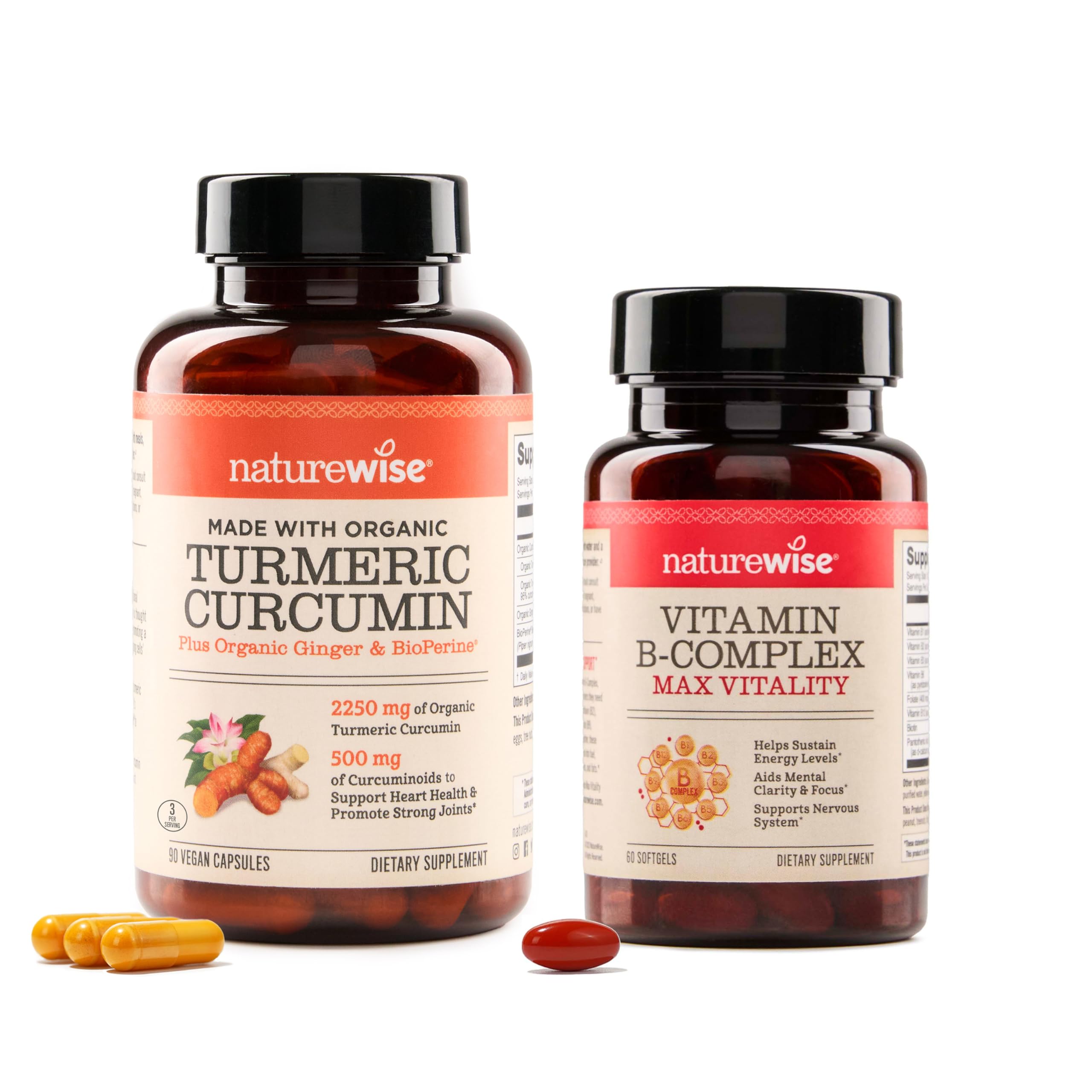 NatureWise Turmeric Curcumin capsules use organic turmeric extract that has been standardized to 95 curcuminoids, the good nutrients found in turmeric, to deliver the benefits of this root. Enhanced with BioPerine black pepper extract, this formula has enhanced bioavailability for better absorption of curcumin. BioPerine, a patented black pepper extract, has been tested by several clinical studies that produced results supporting its ability to aid nutrient absorption, particularly of curcuminoids. Every serving delivers 500 mg of curcuminoids to support your joint health. Our Vitamin B Complex supplement contains a comprehensive array of B vitamins, including B1, B2, B3, B6, biotin (B7), folic acid (B9), and B12. We wanted to provide comprehensive support for your cellular energy production processes, as well as your energy levels throughout the day. Folic acid is an important B vitamin that is beneficial for hair health and for the development of the fetus for pregnant persons. Biotin is also a great addition that supports the health of your hair, skin, and nails. These B vitamins serve as coenzymes, facilitating enzymatic reactions that drive the conversion of macronutrients into usable energy. Through this mechanism, vitamin B ensures the efficient utilization of carbohydrates, proteins, and fats derived from the diet, thereby supporting overall energy levels. NatureWise supplements are proudly manufactured in USA-based facilities that comply to the strictest cGMP standards and are carefully tested by third party laboratories for purity and potency, as well as physical and chemical contamination. Statements regarding dietary supplements have not been evaluated by the FDA and are not intended to diagnose, treat, cure, or prevent any disease or health condition.3rd PARTY TESTED, NSF-CERTIFIED: Vitamin B Complex softgels contents are NSF Nutrient Certified, 3rd party tested for purity and efficacy, and manufactured in the USA with high-quality ingredients from around the world in a cGMP-certified facility. PREMIUM INGREDIENTS: NatureWise Curcumin Turmeric is vegan, gluten-free, and non-GMO. They are manufactured in the USA with high-quality ingredients from around the world in a cGMP-certified facility with third-party quality control audits. SUPERIOR FORMULATION: Our Vitamin B Complex softgels are made with halal gelatin to meet strict dietary restrictions, and do not contain harmful ingredients like magnesium stearate and titanium dioxide. They do not contain wheat, gluten, eggs, soy, milk, tree nuts, peanuts, fish, shellfish, or sesame seeds. WITH ORGANIC TURMERIC ROOT: This clean formula is made from organic turmeric root and organic turmeric extract to deliver a clean curcumin supplement. NERVOUS SYSTEM IMMUNE SUPPORT: Vitamin B Complex may support your cognitive function due to vitamin B's important role in the nervous system. Vitamin B also contributes to the body's immune function and overall health. . SUPPORTS JOINT HEALTH: Turmeric is a common ingredient found in joint support supplements due to its phytonutrients which may promote joint comfort and flexibility. . FOLIC ACID VITAMIN B12: Folic acid, or vitamin B9, helps the body break down, use, and create protein- making it especially useful for pregnant women. Vitamin B12 is an important B vitamin for energy metabolism that works with folic acid to support blood and nerve cell health. . ENHANCED ABSORPTION: Curcumin by itself is poorly absorbed by the body. Our turmeric with black pepper capsules are enhanced with Bioperine, a patented black pepper extract proven to dramatically increase bioavailability. . ENERGY METABOLISM SUPPORT: B Vitamins are important for cellular energy production and metabolism by helping the body convert food into usable energy. Our formula contains a comprehensive B vitamin complex with B1, B2, B3, B6, biotin (B7), folic acid (B9) and B12. 500MG CURCUMINOIDS: Our Curcumin is made from organic turmeric root and organic turmeric extract that is standardized to deliver 95 curcuminoids, the beneficial components in turmeric. Every serving packs 500mg of curcuminoids.