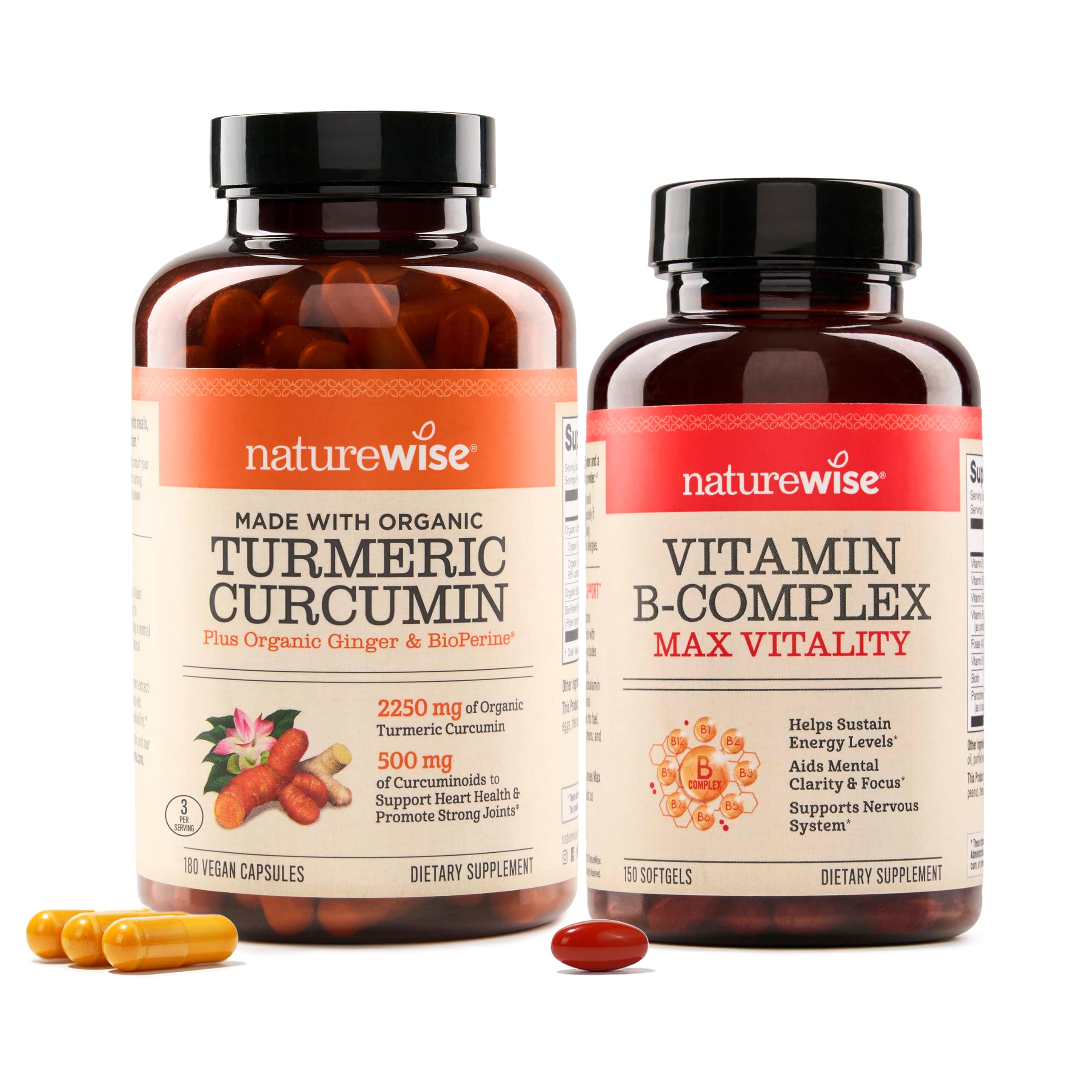This 2-product bundle combines NatureWise's top-rated curcumin turmeric and vitamin B complex supplements to provide joint, energy, and mental support. The curcumin turmeric delivers 500mg of curcuminoids per serving from organic turmeric root and extract standardized to 95 curcuminoids. Curcumin, the beneficial nutrient in turmeric, has been used in Ayurvedic remedies to encourage healthy joint function. This formula boosts curcumin absorption using BioPerine black pepper extract. The vitamin B complex provides a complete array of B vitamins including B1, B2, B3, B6, biotin, folic acid, and B12 to aid cellular energy production, promote mental clarity, and support overall energy levels. Specific B vitamins like folic acid, biotin, and B12 also contribute to hair, skin, and nail health. Together, these two gluten-free, non-GMO supplements complement each other by supporting joint comfort, energy levels, concentration, memory, and mood. The curcumin turmeric eases joint discomfort while the B vitamins sharpen mental clarity and boost energy production. This allows you to stay active and focused each day.GLUTEN-FREE FORMULA: Both the turmeric curcumin and vitamin B complex supplements are gluten-free and dairy-free. SUPPORTS ENERGY LEVELS: B vitamins facilitate the conversion of nutrients into cellular energy to support overall energy levels throughout the day. . ENHANCED ABSORPTION: The turmeric curcumin is enhanced with BioPerine black pepper extract to increase the absorption and bioavailability of the curcuminoids. . COMPREHENSIVE B VITAMINS: The vitamin B complex includes B1, B2, B3, B6, biotin, folic acid, and B12 to support energy metabolism and mental clarity. . 500MG CURCUMINOIDS: The turmeric curcumin contains 500mg of curcuminoids per serving to support joint health. .