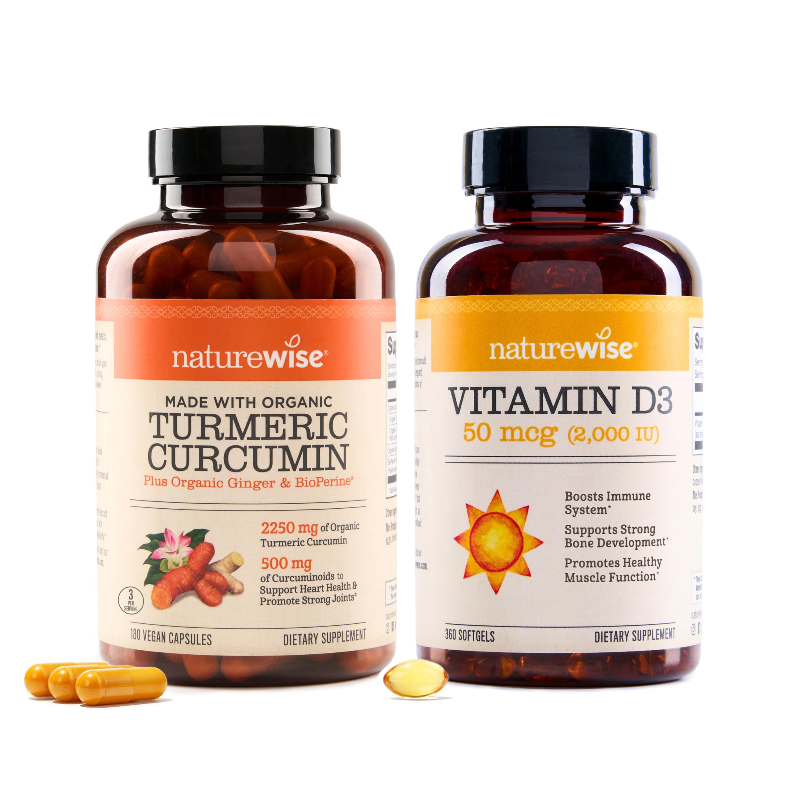 NatureWise Turmeric Curcumin capsules use organic turmeric extract that has been standardized to 95 curcuminoids, the good nutrients found in turmeric, to deliver the benefits of this root. Enhanced with BioPerine black pepper extract, this formula has enhanced bioavailability for better absorption of curcumin. BioPerine, a patented black pepper extract, has been tested by several clinical studies that produced results supporting its ability to aid nutrient absorption, particularly of curcuminoids. Every serving delivers 500 mg of curcuminoids to support your joint health. NatureWise Vitamin D3 softgels deliver the same biologically active form of Vitamin D produced in the body as a result of direct sunlight - without the risk of unprotected UVB exposure. Since Vitamin D is fat-soluble, we include certified organic extra virgin olive oil as a healthy fat source for better absorption. Vitamin D can be found in cells throughout the entire body. It is important for calcium and phosphorus absorption to build and maintain strong bones and teeth, provide immune system support, and for healthy muscle function. NatureWise supplements are proudly manufactured in USA-based facilities that comply to the strictest cGMP standards and are carefully tested by third party laboratories for purity and potency, as well as physical and chemical contamination. Statements regarding dietary supplements have not been evaluated by the FDA and are not intended to diagnose, treat, cure, or prevent any disease or health condition.DIRECTIONS: It's normal for softgels to stick together and clump during warm weather conditions. This does NOT affect the quality or efficacy of the product. To release the clumps, give your bottle a good shake or knock it against the counter. PREMIUM INGREDIENTS: NatureWise Curcumin Turmeric is vegan, gluten-free, and non-GMO. They are manufactured in the USA with high-quality ingredients from around the world in a cGMP-certified facility with third-party quality control audits. UNCOMPROMISING QUALITY: All NatureWise supplements are Manufactured in USA-based facilities that comply to the strictest cGMP standards and undergo rigorous testing by third party labs to ensure the highest quality and purity. WITH ORGANIC TURMERIC ROOT: This clean formula is made from organic turmeric root and organic turmeric extract to deliver a clean curcumin supplement. PURE NATURAL: These Vitamin D3 immune support and bone health supplements are gluten-free and non-GMO. Third party tested for purity and potency. Packaging may vary due to high demand, same great product and ingredients. SUPPORTS JOINT HEALTH: Turmeric is a common ingredient found in joint support supplements due to its phytonutrients which may promote joint comfort and flexibility. . SUNSHINE IN A BOTTLE: The Vitamin D Council recommends daily vitamin D supplementation for most adults to achieve and maintain optimal levels, regardless of weather or season. NatureWise Vitamin D3 is all natural, non-GMO, and gluten free with no artificial additives, fillers or binders. ENHANCED ABSORPTION: Curcumin by itself is poorly absorbed by the body. Our turmeric with black pepper capsules are enhanced with Bioperine, a patented black pepper extract proven to dramatically increase bioavailability. . A VITAL NUTRIENT: Vitamin D supports healthy bones, teeth, muscle function, and a strong immune system. Many people may be deficient in this nutrient, making it even more important for overall health. . 500MG CURCUMINOIDS: Our Curcumin is made from organic turmeric root and organic turmeric extract that is standardized to deliver 95 curcuminoids, the beneficial components in turmeric. Every serving packs 500mg of curcuminoids.