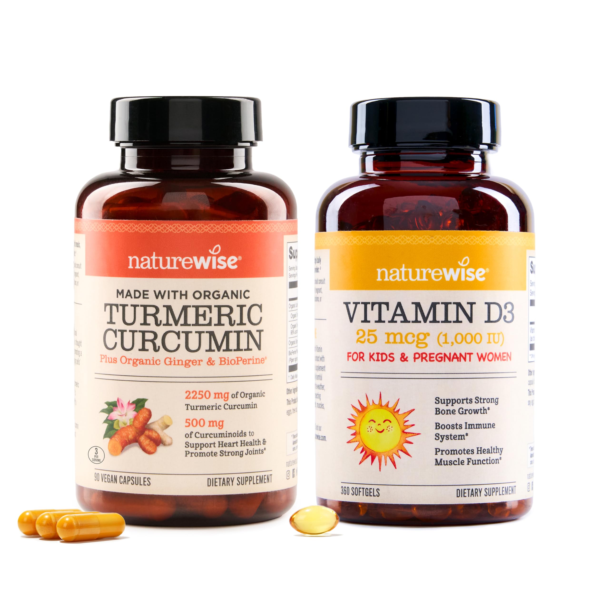 This bundle pairs two high-quality nutritional supplements to promote overall health - NatureWise Curcumin Turmeric and NatureWise Vitamin D3. The NatureWise Curcumin Turmeric supplement provides a substantial 2250mg daily dose of organic curcumin with 95 curcuminoids to support joint health, cardiovascular function, and antioxidant activity in the body. Its absorption is enhanced with BioPerine black pepper extract and organic ginger. With 180 gluten-free, vegan capsules per bottle, it can be taken for a month as part of a daily health regimen. The NatureWise Vitamin D3 supplement delivers 1000IU of vitamin D3 per softgel, which helps the body effectively absorb calcium, strengthen bones and teeth, support muscle function and immune response. The vitamin D3 is suspended in organic olive oil for better absorption. As an essential vitamin, vitamin D plays many critical roles - from bone health to immune support. With 360 easy-to-swallow softgels per bottle, it provides a year's supply of this vital nutrient. Together, these two supplements target different aspects of whole-body wellness. The Curcumin Turmeric supports joint and cardiovascular health from within, while the Vitamin D3 strengthens bones and immunity. Both feature enhanced absorption formulations in plant-based capsules. This bundle offers a simple way to add these two foundational supplements into a daily health routine.