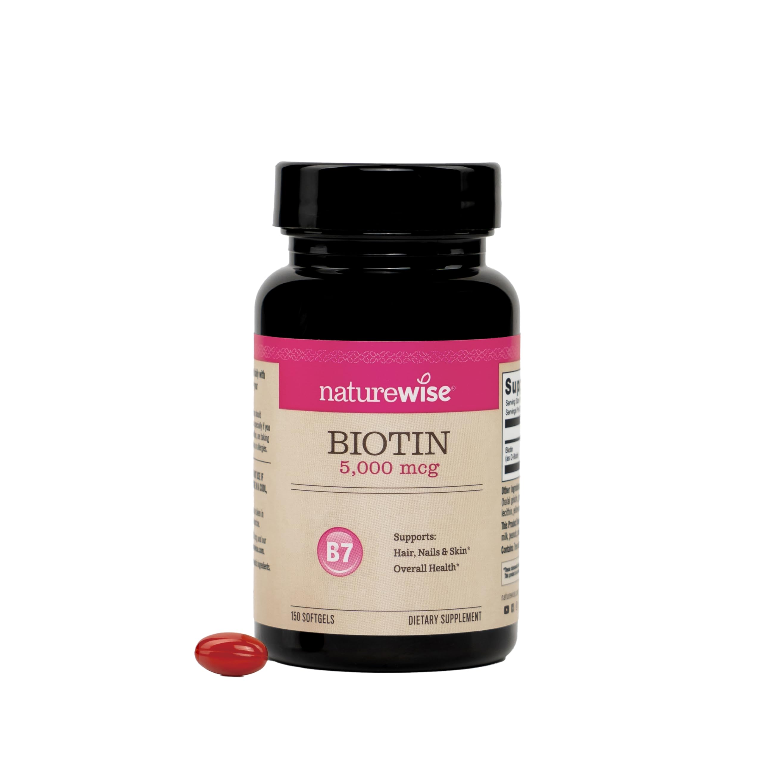 NatureWise Extra Strength Biotin 5,000 mcg delivers a powerful daily dose of vitamin B7, an essential nutrient that supports both beauty and overall wellness. Each easy-to-swallow softgel provides 5,000 mcg of biotin in a highly absorbable form to help you feel and look your best. Biotin is well known for its role in supporting healthy hair, strong nails, and radiant skin. By helping to maintain keratin structure, this essential B-vitamin provides daily beauty support from within. Beyond its cosmetic benefits, biotin also plays a key role in converting carbohydrates, proteins, and fats into usable energy at the cellular level, making it an important nutrient for overall metabolic support. To further enhance absorption, our biotin softgels are made with organic cold-pressed coconut oil, processed without heat or hexanes to preserve purity and effectiveness. Each formula is clean and carefully made — Non-GMO, free from artificial colors and flavors, and crafted with halal gelatin. Our supplements contain no wheat, gluten, eggs, dairy, peanuts, shellfish, fish, or sesame, though they do include tree nuts (coconut). Every batch of NatureWise Biotin is third-party tested for purity and potency, and manufactured in the USA in a cGMP-certified facility to ensure consistent quality you can trust. These statements have not been evaluated by the Food and Drug Administration. This product is not intended to diagnose, treat, cure, or prevent any disease.3rd PARTY TESTED, USA MANUFACTURED: NatureWise Biotin 5000mcg Softgels are 3rd party tested for purity and efficacy and are manufactured in the USA with clean ingredients in a cGMP-certified facility. NON-GMO, MADE WITH HALAL GELATIN: NatureWise Biotin 5,000 mcg softgels have no artificial colors or flavors. It is non-GMO and uses halal gelatin. It does not contain wheat, gluten, eggs, dairy, milk, peanuts, shellfish, fish or sesame. It does contain tree nuts (coconut). SUPERIOR ABSORPTION WITH ORGANIC COLD-PRESSED COCONUT OIL: This biotin supplement is made with cold-pressed coconut oil, made without any heat or hexanes, to support biotin absorption. . CELLULAR ENERGY PRODUCTION SUPPORT: Vitamin B7 is a B-complex vitamin that contributes to metabolizing carbohydrates, proteins and fats to usable energy at the cellular level. . HAIR, SKIN NAILS SUPPORT: This biotin supplement provides support for healthy and strong hair and nail growth, as well as skin support. . EXTRA STRENGTH BIOTIN 5,000 mcg: This biotin supplement contains a potent dose of 5,000 mcg of biotin per softgel, also known as vitamin B7.