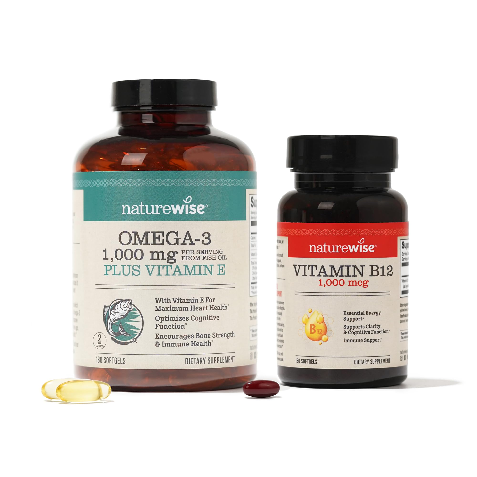 NatureWise High-Potency 1000mg Omega 3 600mg EPA 400mg DHA Vitamin E 180ct & 1000mcg Vitamin B12 150 Softgels Supplement Bundle