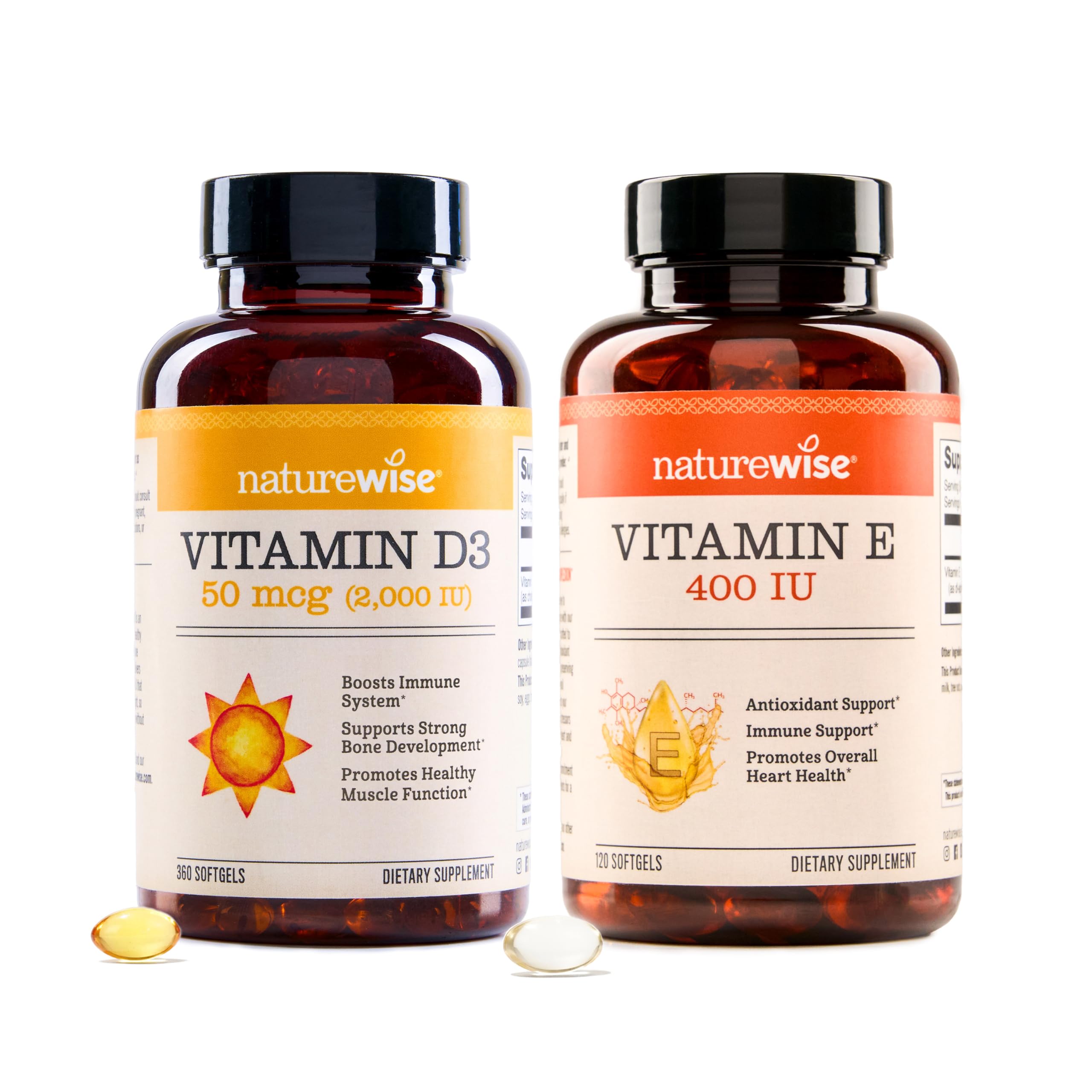 NatureWise Vitamin D3 softgels deliver the same biologically active form of Vitamin D produced in the body as a result of direct sunlight - without the risk of unprotected UVB exposure. Since Vitamin D is fat-soluble, we include certified organic extra virgin olive oil as a healthy fat source for better absorption. Vitamin D can be found in cells throughout the entire body. It is important for calcium and phosphorus absorption to build and maintain strong bones and teeth, provide immune system support, and for healthy muscle function. Naturewise Vitamin E contains 180mg or 400 IU of vitamin E in every softgel. Vitamin E is supportive of a variety of functions and mechanisms in your body. It supports your overall immune health and function by supporting your immune system's defense mechanisms. Vitamin E is also known for its ability to support the skin, contributing to healthy aging. Incorporating this Vitamin E supplement into your daily routine alongside your regular skincare regimen can significantly enhance your skin health and appearance from within. Moreover, Vitamin E may support eye health and vision. NatureWise supplements are proudly manufactured in USA-based facilities that comply to the strictest cGMP standards and are carefully tested by third party laboratories for purity and potency, as well as physical and chemical contamination. Statements regarding dietary supplements have not been evaluated by the FDA and are not intended to diagnose, treat, cure, or prevent any disease or health condition.400 IU VITAMIN E: Take one halal gelatin softgel per day to get 180 mg or 400 IU of vitamin E to support your immune and skin health daily. DIRECTIONS: It's normal for softgels to stick together and clump during warm weather conditions. This does NOT affect the quality or efficacy of the product. To release the clumps, give your bottle a good shake or knock it against the counter. 3rd PARTY TESTED, NSF NUTRIENT CERTIFIED: NatureWise Vitamin E softgels are 3rd party tested by the NSF to meet their standards for public health, safety, purity, and efficacy, and manufactured in the USA with high-quality ingredients from around the world in a cGMP-certified facility. UNCOMPROMISING QUALITY: All NatureWise supplements are Manufactured in USA-based facilities that comply to the strictest cGMP standards and undergo rigorous testing by third party labs to ensure the highest quality and purity. MADE WITH HALAL GELATIN, NON-GMO: Our Vitamin E softgels are made with halal gelatin and are non-GMO to meet the highest quality standards. They do not contain gluten, wheat, dairy, eggs, soy, milk, peanuts, tree nuts, fish, shellfish, or sesame. PURE NATURAL: These Vitamin D3 immune support and bone health supplements are gluten-free and non-GMO. Third party tested for purity and potency. Packaging may vary due to high demand, same great product and ingredients. SUPPORT FOR SKIN, EYES, VISION: Vitamin E is a great antioxidant for improving the health and appearance of your skin. Vitamin E is also known to support your eye health and vision. . SUNSHINE IN A BOTTLE: The Vitamin D Council recommends daily vitamin D supplementation for most adults to achieve and maintain optimal levels, regardless of weather or season. NatureWise Vitamin D3 is all natural, non-GMO, and gluten free with no artificial additives, fillers or binders. ANTIOXIDANT IMMUNE SUPPORT: NatureWise Vitamin E is a powerful antioxidant that supports immune health and function, assisting in the body's ability to respond effectively to immune challenges. . A VITAL NUTRIENT: Vitamin D supports healthy bones, teeth, muscle function, and a strong immune system. Many people may be deficient in this nutrient, making it even more important for overall health. .