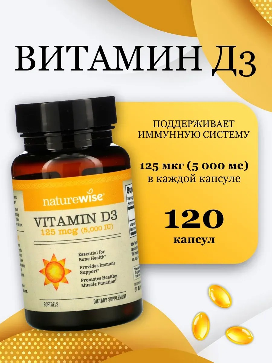 Наш витамин D3 подходит для мужчин и женщин, которые ищут здоровый баланс витамина D (женские и мужские витамины). Благодаря Витамину Д 3 (рыбий жир в капсулах) происходит укрепление костных и хрящевых тканей, суставов, укрепление сердечно-сосудистой и нервной систем, предотвращение усталости, вялости и сонливости (для энергии), помогает от выпадения волос, для укрепления зубов, иммунитета, роста ногтей. Без искусственных ингредиентов - сделано США. Мы заботимся о том, как производятся ваши витамины и что в них содержится. Витамин D3 (d vitamin) производится без искусственных ингредиентов, в соответствии с самыми высокими стандартами производства в мире. Принимайте всего одну капсулу витамина D3 в капсулах в день - не нужно напоминать себе о необходимости принимать несколько таблеток в течение дня. Устраните дефицит витамина D (д3). В дополнение к обеспечению здорового баланса витамина D для взрослых, витамин D3 от NatureWise также может быть идеальным для тех, у кого дефицит витамина D. Предупреждение о безопасности: не предназначен для употребления лицами младше 18 лет. Если вы принимаете какие-либо лекарства или комплекс витаминов (витаминный комплекс, мультивитамины, поливитамины), или у вас есть какие-либо заболевания, особенно если вы беременны или кормите грудью, проконсультируйтесь с врачом (БАДы) перед использованием. Прекратите использование и обратитесь к врачу при возникновении побочных реакций. Не используйте, если отсутствует или повреждена внешняя прокладка флакона. Пищевые добавки не следует использовать в качестве замены разнообразного питания и здорового образа жизни (ЗОЖ). Хранение: беречь от прямых солнечных лучей. Хранить в сухом прохладном месте. Хранить в недоступном для детей месте.