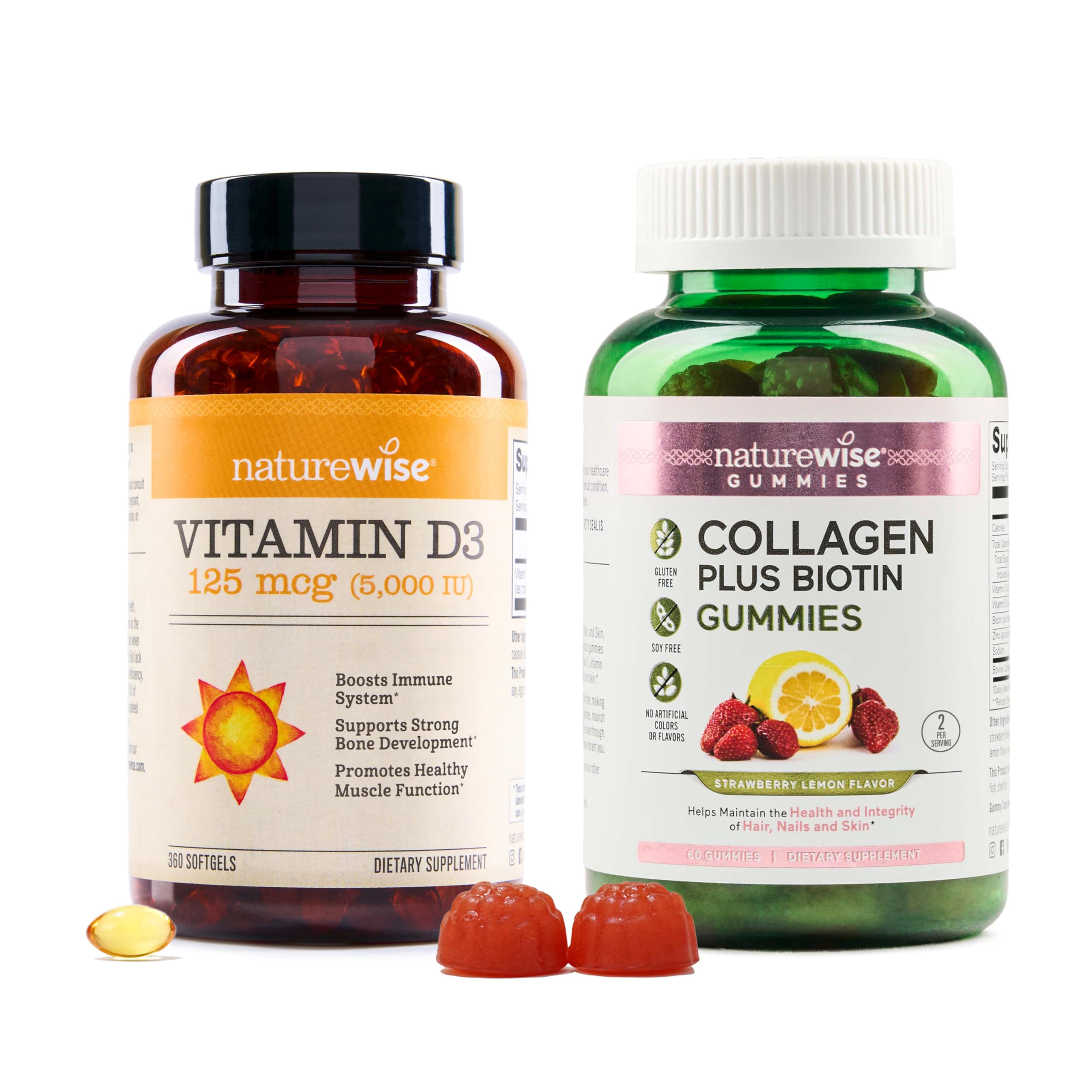 NatureWise Vitamin D3 5000IU and Collagen Gummies bundle is a comprehensive bundle designed to both immune health and beauty (hair, skin, and nails). This powerful combination provides nutrients that support immune function, skin elasticity, and collagen synthesis. NatureWise Vitamin D3 delivers 5000 IU (125mg) of absorption-friendly Vitamin D3. This high-potency formula is crafted for proper absorption and utilization, helping you maintain healthy vitamin D levels, especially in seasons with limited sun exposure. NatureWise Collagen Gummies contain high-quality types I and III collagen peptides to add more collagen to your system, which may help support collagen synthesis and skin elasticity. NatureWise Collagen Gummies also have a dose of biotin, an important vitamin that contributes to shiny hair and strong nails. Vitamin C is critical for collagen synthesis, which is why the NatureWise Collagen Gummies are fortified with Vitamin C, to help you get the most out of these collagen gummies. Added vitamin E is a fat-soluble nutrient that provides additional antioxidant support, and contributes to your skin's appearance, elasticity, and hydration. Both the Vitamin D3 and Collagen Gummies are gluten-free, non-GMO, and do not contain wheat, soy, eggs, dairy, peanuts, tree nuts, fish, and shellfish. Manufactured in the USA in a cGMP-certified facility, these supplements undergo rigorous third-party quality control to ensure safety and efficacy. Statements regarding dietary supplements have not been evaluated by the FDA and are not intended to diagnose, treat, cure, or prevent any disease or health condition.PREMIUM INGREDIENTS: NatureWise Collagen Gummies are manufactured in the USA with high-quality ingredients from around the world in a cGMP-certified facility with third-party quality control audits. These gummies do not contain gelatin, gluten, wheat, dairy, peanuts, soy, eggs, shellfish, or fish. Directions: It's normal for softgels to stick together and clump during warm weather conditions. This does NOT affect the quality or efficacy of the product. To release the clumps, give your bottle a good shake or knock it against the counter. STRAWBERRY LEMON FLAVOR: These sweet and tart gummies are strawberry lemon flavored, making your beauty routine a sweet treat for your taste buds. Uncompromising Quality: All NatureWise supplements are Manufactured in USA-based facilities that comply to the strictest cGMP standards and undergo rigorous testing by third party labs to ensure the highest quality and purity. PLUS VITAMIN C E: Vitamin C is important for your body's production of collagen, which is why our formula contains this nutrient. Vitamin E is a fat-soluble antioxidant that is important for retaining skin elasticity and hydration. . Pure natural: These Vitamin D3 immune support and bone health supplements are gluten-free and non-GMO. Third party tested for purity and potency. Packaging may vary due to high demand, same great product and ingredients. TYPE I III COLLAGEN PEPTIDES: These collagen gummies are formulated with hydrolyzed collagen peptides types I and III, which support skin elasticity, joint health, and hair strength. . Sunshine In a Bottle: The Vitamin D Council recommends daily vitamin D supplementation for most adults to achieve and maintain optimal levels, regardless of weather or season. NatureWise Vitamin D3 is all natural, non-GMO, and gluten free with no artificial additives, fillers or binders. HAIR, SKIN, AND NAILS: Indulge in these collagen and biotin gummies to support the natural shine and strength of your hair, skin, and nails. . A Vital Nutrient: Vitamin D plays a crucial role in supporting healthy bones, teeth, muscle function, and a strong immune system. Many people may be deficient in this essential nutrient, making it even more important for overall health.