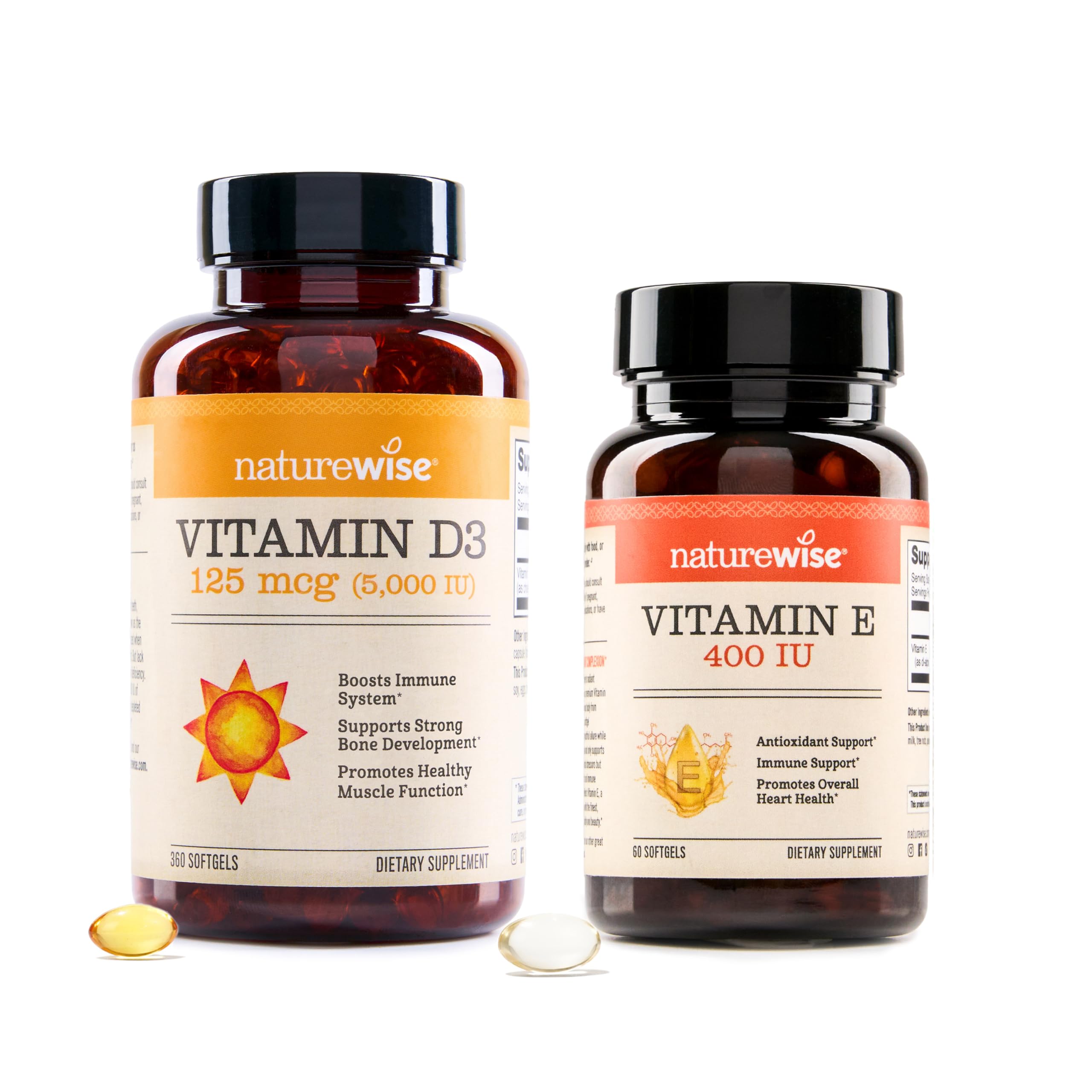 NatureWise Vitamin D3 softgels deliver the same biologically active form of Vitamin D produced in the body as a result of direct sunlight - without the risk of unprotected UVB exposure. Since Vitamin D is fat-soluble, we include certified organic extra virgin olive oil as a healthy fat source for better absorption. Vitamin D can be found in cells throughout the entire body. It is important for calcium and phosphorus absorption to build and maintain strong bones and teeth, provide immune system support, and for healthy muscle function. Naturewise Vitamin E contains 180mg or 400 IU of vitamin E in every softgel. Vitamin E is supportive of a variety of functions and mechanisms in your body. It supports your overall immune health and function by supporting your immune system's defense mechanisms. Vitamin E is also known for its ability to support the skin, contributing to healthy aging. Incorporating this Vitamin E supplement into your daily routine alongside your regular skincare regimen can significantly enhance your skin health and appearance from within. Moreover, Vitamin E may support eye health and vision. NatureWise supplements are proudly manufactured in USA-based facilities that comply to the strictest cGMP standards and are carefully tested by third party laboratories for purity and potency, as well as physical and chemical contamination. Statements regarding dietary supplements have not been evaluated by the FDA and are not intended to diagnose, treat, cure, or prevent any disease or health condition.400 IU VITAMIN E: Take one halal gelatin softgel per day to get 180 mg or 400 IU of vitamin E to support your immune and skin health daily. DIRECTIONS: It's normal for softgels to stick together and clump during warm weather conditions. This does NOT affect the quality or efficacy of the product. To release the clumps, give your bottle a good shake or knock it against the counter. 3rd PARTY TESTED, NSF NUTRIENT CERTIFIED: NatureWise Vitamin E softgels are 3rd party tested by the NSF to meet their standards for public health, safety, purity, and efficacy, and manufactured in the USA with high-quality ingredients from around the world in a cGMP-certified facility. UNCOMPROMISING QUALITY: All NatureWise supplements are Manufactured in USA-based facilities that comply to the strictest cGMP standards and undergo rigorous testing by third party labs to ensure the highest quality and purity. MADE WITH HALAL GELATIN, NON-GMO: Our Vitamin E softgels are made with halal gelatin and are non-GMO to meet the highest quality standards. They do not contain gluten, wheat, dairy, eggs, soy, milk, peanuts, tree nuts, fish, shellfish, or sesame. PURE NATURAL: These Vitamin D3 immune support and bone health supplements are gluten-free and non-GMO. Third party tested for purity and potency. Packaging may vary due to high demand, same great product and ingredients. SUPPORT FOR SKIN, EYES, VISION: Vitamin E is a great antioxidant for improving the health and appearance of your skin. Vitamin E is also known to support your eye health and vision. . SUNSHINE IN A BOTTLE: The Vitamin D Council recommends daily vitamin D supplementation for most adults to achieve and maintain optimal levels, regardless of weather or season. NatureWise Vitamin D3 is all natural, non-GMO, and gluten free with no artificial additives, fillers or binders. ANTIOXIDANT IMMUNE SUPPORT: NatureWise Vitamin E is a powerful antioxidant that supports immune health and function, assisting in the body's ability to respond effectively to immune challenges. . A VITAL NUTRIENT: Vitamin D supports healthy bones, teeth, muscle function, and a strong immune system. Many people may be deficient in this nutrient, making it even more important for overall health. .