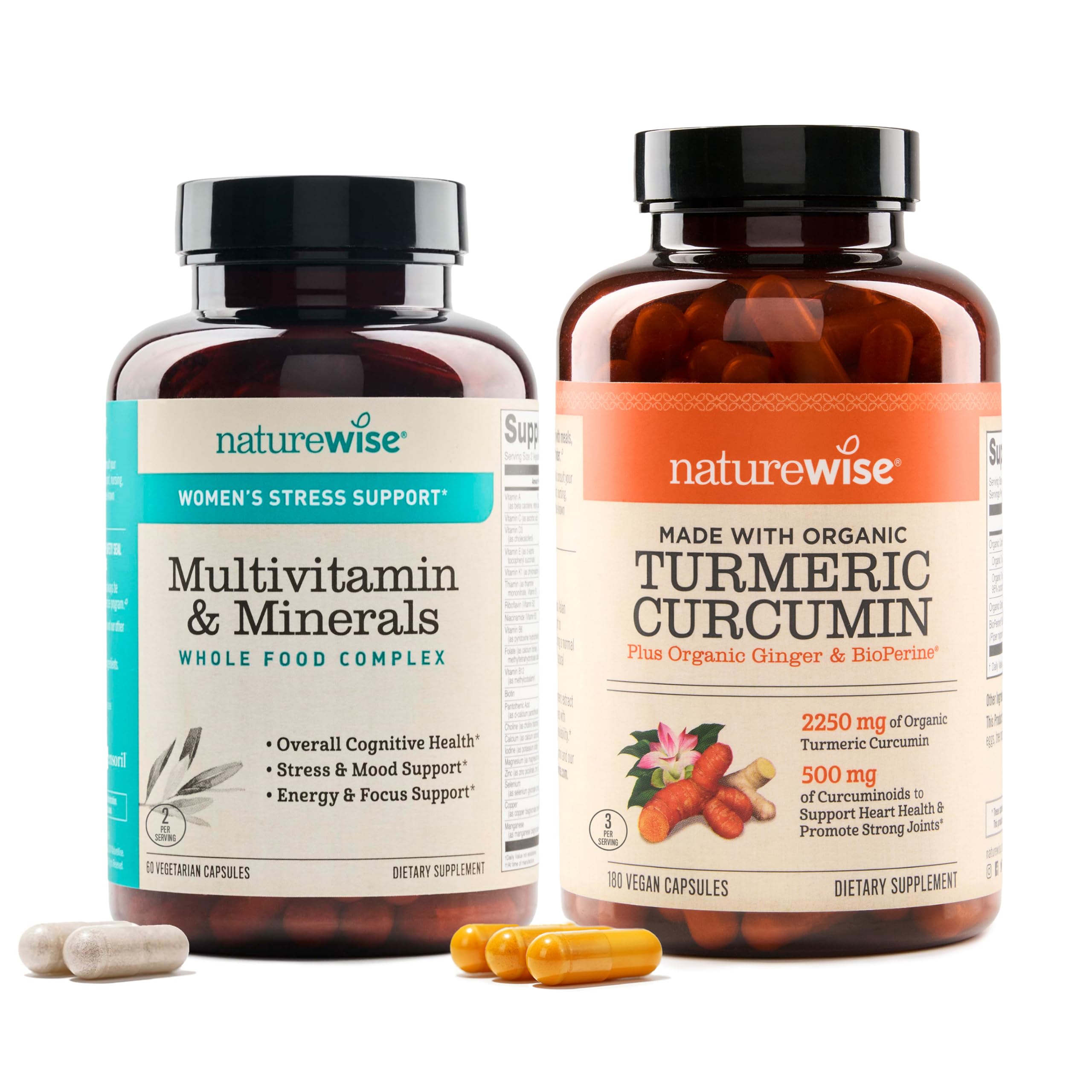 Bring together the studied stress-balancing properties of Sensoril ashwagandha and the joint health benefits of curcumin with NatureWise's Women's Stress Support Multivitamin and Curcumin Turmeric 2250mg supplements. The Women's Stress Support Multivitamin provides complete daily nutrition specially formulated for women with 23 essential vitamins and minerals, 12 organic fruits and vegetables, probiotics, and 60 capsules of Sensoril ashwagandha to encourage stress adaptation and mood balance. Sensoril ashwagandha is an adaptogen that helps counteract negative effects of stress. Pair it with 180 capsules of the Curcumin Turmeric, which uses 95 curcuminoids to deliver 500mg per serving for enhanced absorption and bioavailability. Curcumin, found in turmeric root, is known to support joint health and flexibility. This formula also includes Bioperine, a black pepper extract that increases curcuminoid absorption. With the Women's Stress Support Multivitamin working to restore balance and health from within and the Curcumin Turmeric supporting joint comfort, this bundle offers a multifaceted approach to wellbeing. Both products use premium ingredients, are vegan and gluten-free, and are made in a cGMP-certified facility.