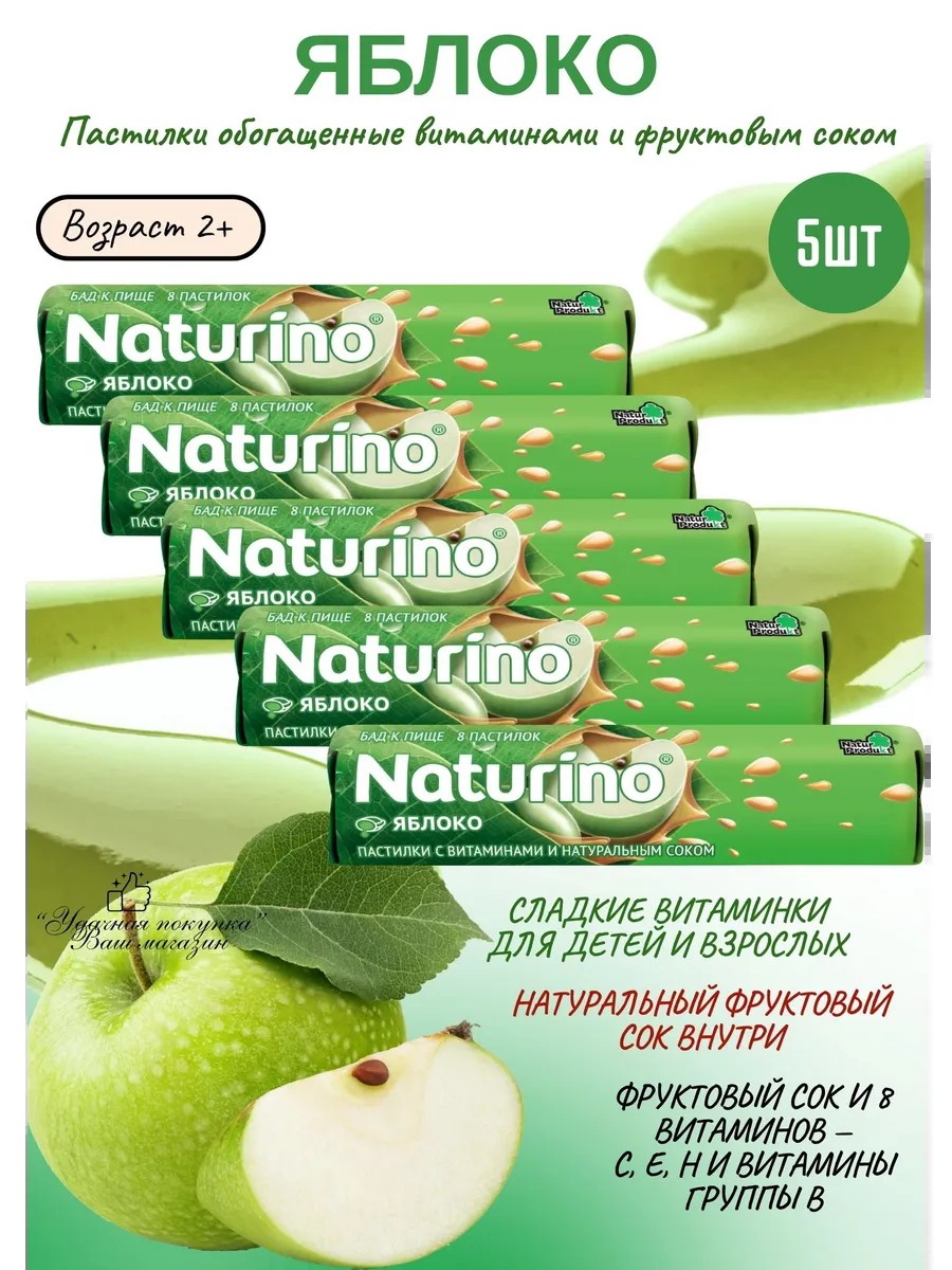 Натурино — это биологически активная добавка к пище, при производстве которой не используются консерванты, ГМО. Эти пастилки предназначены детям от 2-х лет и взрослым, которые стремятся восполнить суточную потребность организма в витаминах и микроэлементах. Натурино имеет в своем составе фруктовый сок и 8 витаминов — С, Е и группы В. Обогащая рацион, эти витамины оказывают благотворное влияние на развитие организма вашего ребенка.