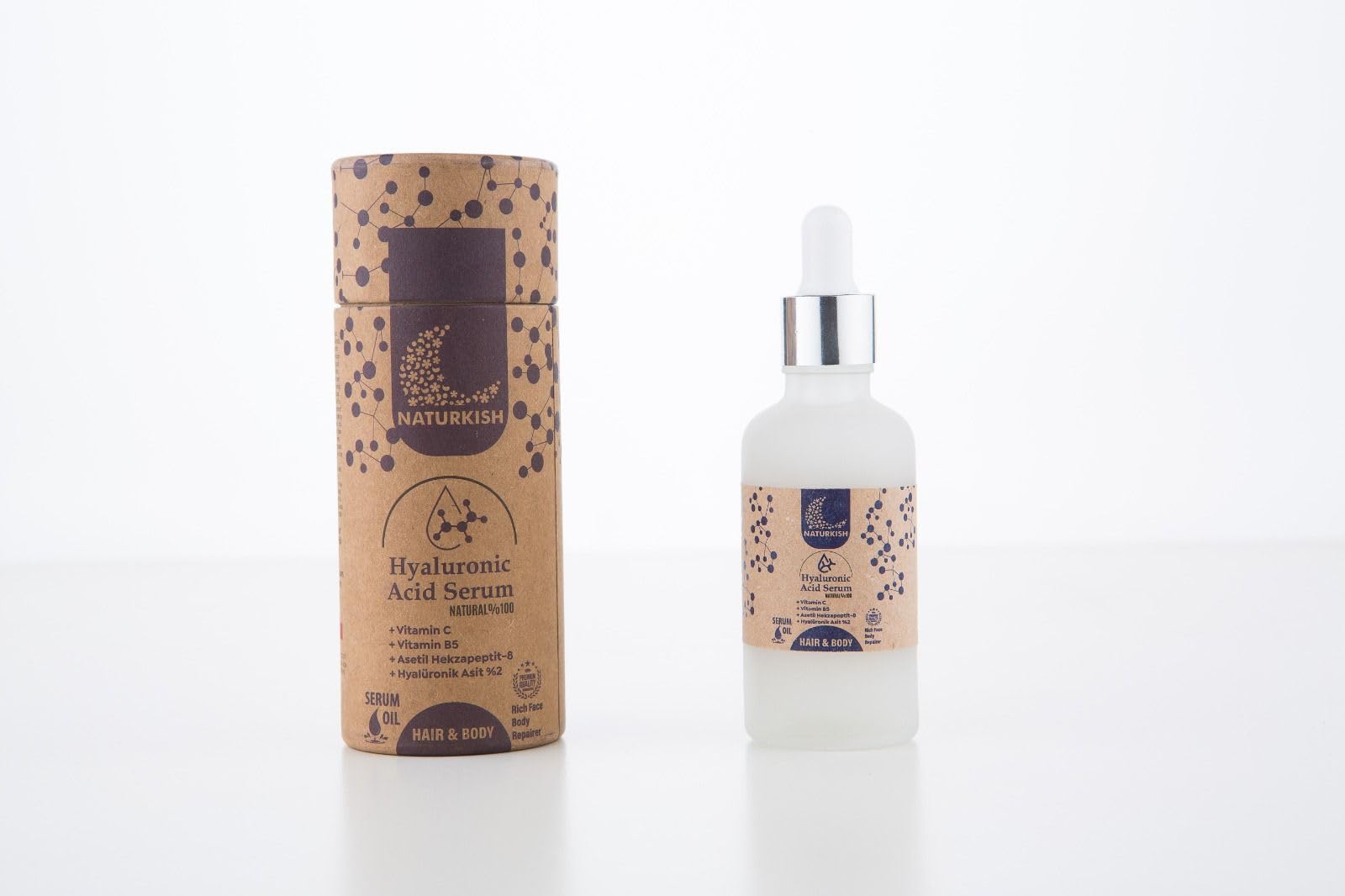 Experience the transformative power of Naturkish's Hyaluronic Acid Serum. This natural wonder harnesses the potent combination of Vitamin C, Vitamin B5, and Acetyl Hexapeptide-8, infused with the hydrating prowess of Hyaluronic Acid. Designed to nourish and revitalize your skin, this serum delivers a radiant, youthful glow. Suitable for both hair and body, it effortlessly absorbs into your skin, leaving you feeling refreshed and rejuvenated. Embrace the natural goodness of Naturkish and unveil your most beautiful self.