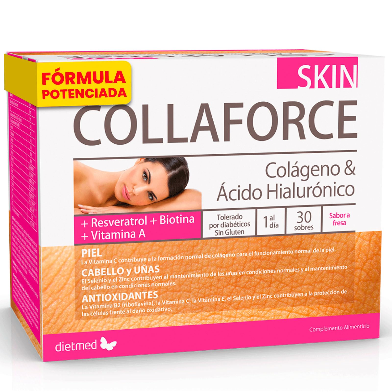 Collaforce Skin is a Dietmed product that combines various ingredients with strong antioxidant properties, such as resveratrol. Collaforce Skin harnesses the power of hydrolyzed collagen to help maintain healthy skin. As we age, skin suffers from problems such as wrinkles, dryness, and loss of density. Collaforce Skin helps mitigate these types of damage, thanks to collagen, hyaluronic acid, and antioxidants like resveratrol. Main ingredients: Enzymatically hydrolyzed collagen 500 mg, Acai 150 mg, Pomegranate (containing at least 40 ellagic acid) 50 mg, Red vine (containing at least 95 OPC) 20 mg, Resveratrol 10 mg, Hyaluronic acid 10 mg, L-methionine 100 mg, L-cysteine 100 mg, Vitamin A 800 mcg. Vitamin B2 1.4 mg, Niacin 16 mg, Biotin 50 mcg, Vitamin C 80 mg, Vitamin E 12 mg, Selenium 55 mcg, Silicon 15 mg, and Zinc 10 mg. Directions: It is recommended to take 1 sachet per day, after breakfast. Can be taken diluted in water or fruit juice. Presentation: Box of 30 Collaforce Skin Dietmed sachets. INGREDIENTS Collaforce Skin by Dietmed is a food supplement that improves skin beauty by mitigating the effects of aging. Prevention treatment of accelerated skin aging. Helps reduce wrinkles, hydrate the skin, improve skin elasticity, and protect the skin against environmental aggressors and contributing factors such as stress, smoking, hormonal changes (menopause), and exposure to UVB radiation. Prevention. Treatment of side effectsDietary supplements should not be used as a substitute for a varied and balanced diet. It is important to maintain a varied and balanced diet and a healthy lifestyle. Dietmed Collaforce Skin Pack of 30 sachets.Collaforce Skin Lot de 30 sachets DietmedDESCRIPTION DU PRODUIT DESCRIPTION DU PRODUIT Collaforce Skin est un produit de Dietmed qui combine différents ingrédients avec un fort pouvoir antioxydant, comme le resvératrol. Collaforce Skin utilise la force du collagène hydrolysé pour contribuer au maintien de notre peau. Avec l'âge, la peau souffre de problèmes tels que les rides, la sécheresse ou la perte de densité. Collaforce Skin aide à atténuer ce type de dommages, grâce au collagène, à l'acide hyaluronique et aux antioxydants comme le resvératrol. Composition principale : Collagène hydrolysé enzymatiquement 500 mg Acai 150 mg Grenade (contenant au moins 40 d'acide ellagique) 50 mg Vigne rouge (contenant au moins 95 d'OPC) 20 mg Resvératrol 10 mg Acide hyaluronique 10 mg L-méthionine 100 mg L-cystéine 100 mg Vitamine A 800 mcg. Vitamine B2 1,4 mg Niacine 16 mg Biotine 50Mcg. Vitamine C 80 mg Vitamine E 12 mg Sélénium 55Mcg. Silicium 15 mg et zinc 10 mg. Mode d'emploi : il est recommandé de prendre 1 sachet par jour, après le petit déjeuner. Peut être pris dilué dans de l'eau ou dans du jus de fruits. Présentation : Boîte de 30 enveloppes Collaforce Skin Dietmed. INGRÉDIENTS Collaforce Skin de Dietmed est un complément alimentaire qui améliore la beauté de la peau en atténuant les effets de l'âge. Prévention traitement du vieillissement cutané accéléré. Aide à la réduction des rides, à l'hydratation de la peau, à l'amélioration de l'élasticité de la peau, à la protection de la peau contre les agressions environnementales, aux facteurs potentialisants tels que le stress, le tabac, les perturbations hormonales (ménopause) et l'exposition aux radiations. UVB. Prévention. Traitement des effetsLes compléments alimentaires ne doivent pas être utilisés comme substituts à une alimentation variée et équilibrée. Il est important de suivre une alimentation variée et équilibrée et un mode de vie sain. Dietmed Collaforce Skin Lot de 30 enveloppes.