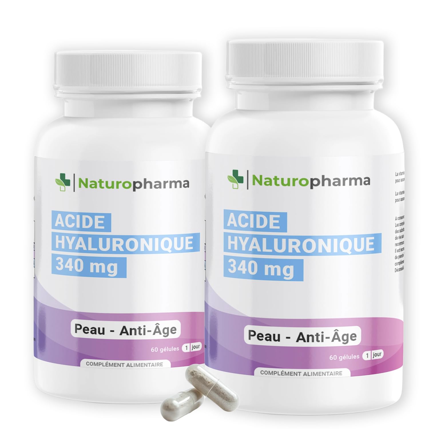 2 Packs - 4-Month Supply PREMIUM HYALURONIC ACID 340 MG FOR HYDRATED, PLUMP, AND RADIANT SKIN Our pure Hyaluronic Acid supplement, enriched with Vitamin C, Vitamin E, and Zinc, is designed to deeply hydrate your skin while reducing the visible signs of aging. This comprehensive formula also promotes joint health and overall well-being. INGREDIENTS Hyaluronic AcidTHE NATUROPHARMA PROMISE At Naturopharma, we put nature and science at the service of your beauty and well-being. Each product is carefully designed to offer impeccable quality and visible benefits, while respecting your body's balance. SUPERIOR QUALITY FOR YOUR PEACE OF MIND GMO-free, gluten-free, and formulated with rigorously selected ingredients, our Hyaluronic Acid meets the most demanding standards to guarantee your satisfaction and safety. SIMPLE AND PRACTICAL USE A one-month course of treatment easily integrated into your daily routine. Quick intake for lasting results, without constraints or effort. Ideal for women and men looking for an effective solution to care for their skin and joints. A HIGHLY ABSORBABLE AND POWERFUL FORMULA Our carefully selected Hyaluronic Acid offers optimal bioavailability for fast and visible results. Combined with essential nutrients like Vitamin C to boost natural collagen production and Zinc to protect skin against oxidative stress, this formula works synergistically to maximize its anti-aging and hydrating benefits. ✓ MULTIPLE BENEFITS FOR A BEAUTY AND WELLNESS ROUTINE Intense Hydration: Plumps skin from within for a visibly fresher and more radiant complexion. Anti-Aging Effect: Diminishes the appearance of wrinkles and promotes firmer, more elastic skin. Joint Health: Supports joint flexibility and everyday comfort. Natural Strengthening: Contributes to shinier hair and stronger nails. 2 Packs - 4-Month Supply PREMIUM HYALURONIC ACID 340 MG FOR HYDRATED, PLUMP, AND RADIANT SKIN Our pure Hyaluronic Acid supplement, enriched with Vitamin C, Vitamin E, and Zinc, is designed to deeply hydrate your skin while reducing the visible signs of aging. This comprehensive formula also promotes joint health and overall well-being.2 Packs, Cure de 4 mois - Acide Hyaluronique 340 mg, Naturopharma, Complément Alimentaire Anti-Âge, 120 Gélules.DESCRIPTION DU PRODUIT DESCRIPTION DU PRODUIT 2 Packs - Cure de 4 mois ACIDE HYALURONIQUE 340 MG PREMIUM POUR UNE PEAU HYDRATÉE, REPULPÉE ET ÉCLATANTE Notre complément à base d'Acide Hyaluronique pur, enrichi en Vitamine C, Vitamine E et Zinc, est conçu pour hydrater votre peau en profondeur tout en réduisant les signes visibles de l'âge. Cette formule complète favorise également la santé des articulations et un bien-être global. INGRÉDIENTS Acide HyaluroniqueLA PROMESSE NATUROPHARMA Chez Naturopharma, nous mettons la nature et la science au service de votre beauté et de votre bien-être. Chaque produit est conçu avec soin pour offrir une qualité irréprochable et des bienfaits visibles, tout en respectant l'équilibre de votre corps. QUALITÉ SUPÉRIEURE POUR VOTRE TRANQUILLITÉ D'ESPRIT Sans OGM, sans gluten et formulé avec des ingrédients rigoureusement sélectionnés, notre Acide Hyaluronique répond aux normes les plus exigeantes pour garantir votre satisfaction et votre sécurité. UNE UTILISATION SIMPLE ET PRATIQUE Une cure d'un mois facile à intégrer dans votre routine quotidienne. Une prise rapide pour des résultats durables, sans contrainte ni effort. Idéal pour les femmes et les hommes qui recherchent une solution efficace pour prendre soin de leur peau et de leurs articulations. UNE FORMULE HAUTEMENT ABSORBABLE ET PUISSANTE Notre Acide Hyaluronique, soigneusement sélectionné, offre une biodisponibilité optimale pour des résultats rapides et visibles. Associé à des nutriments essentiels comme la Vitamine C pour stimuler la production naturelle de collagène et le Zinc pour protéger la peau contre le stress oxydatif, cette formule agit en synergie pour maximiser ses bienfaits anti-âge et hydratants. ✓ BIENFAITS MULTIPLES POUR UNE ROUTINE BEAUTÉ ET BIEN-ÊTRE Hydratation Intense : Repulpe la peau de l'intérieur pour un teint visiblement plus frais et lumineux. Effet Anti-Âge : Diminue l'apparence des rides et favorise une peau plus ferme et élastique. Santé des Articulations : Soutient la souplesse articulaire et le confort au quotidien. Renforcement Naturel : Contribue à des cheveux plus brillants et des ongles renforcés. 2 Packs - Cure de 4 Mois ACIDE HYALURONIQUE 340 MG PREMIUM POUR UNE PEAU HYDRATÉE, REPULPÉE ET ÉCLATANTE Notre complément à base d'Acide Hyaluronique pur, enrichi en Vitamine C, Vitamine E et Zinc, est conçu pour hydrater votre peau en profondeur tout en réduisant les signes visibles de l'âge. Cette formule complète favorise également la santé des articulations et un bien-être global.