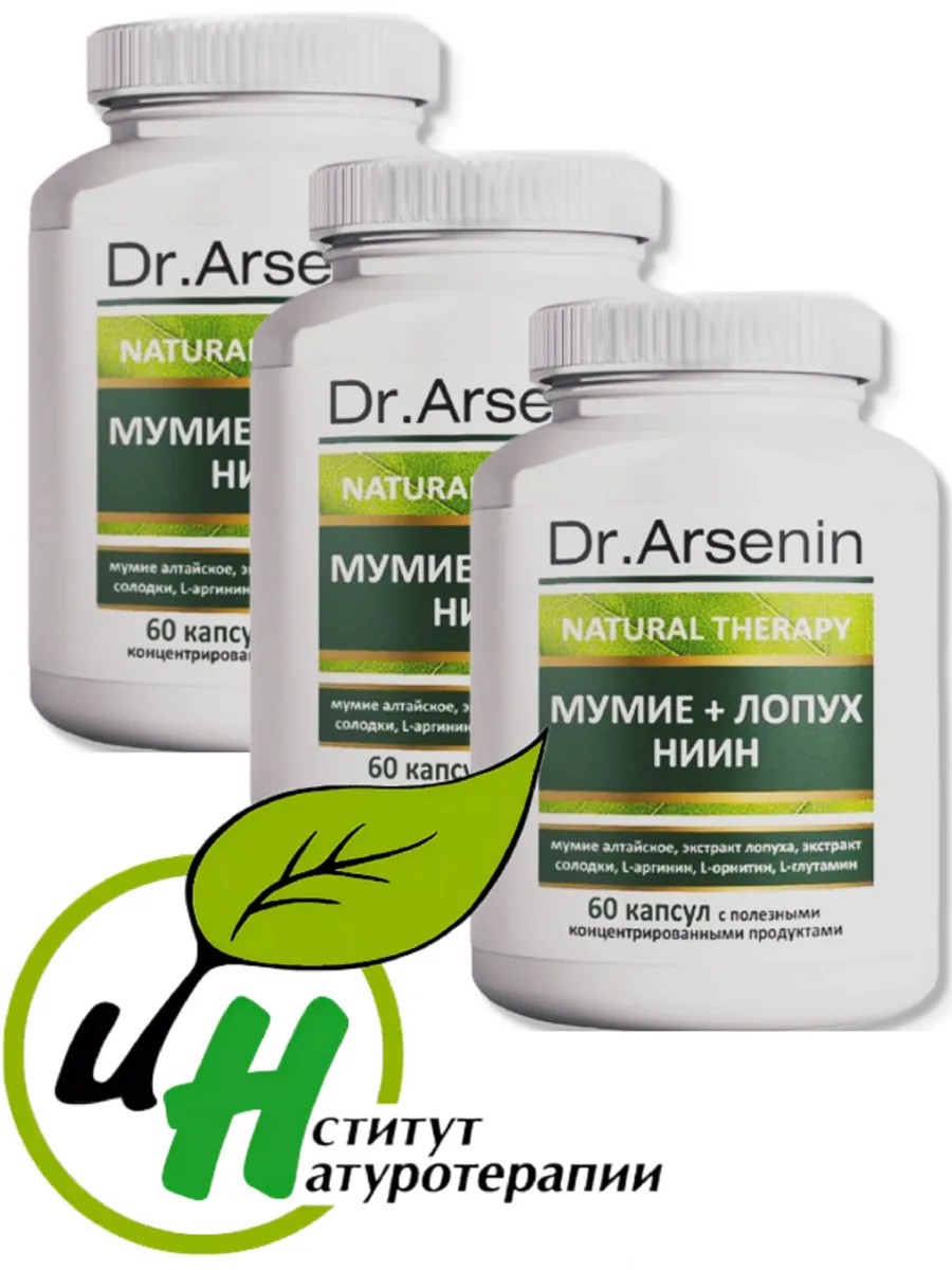 Dr. Arsenin Доктор Арсенин Натуротерапия. Мумие+Лопух НИИН. Лопух - одно из самых древних растений, используемых в медицине. В Китае корень лопуха называют "Русский женьшень". Его собирают лишь один месяц в году. В это время в его корнях находится максимальная концентрация L-та-аспарагина - самого полезного вещества из когда-либо открытых учеными. Лопух (Экстракт корня лопуха) - прекрасное лимфотропное вещество. Используется для выведения токсинов и метаболитов, для восстановления работы лимфоцитов и иммунитета. Экстракт лопуха активизирует защиту организма от инфекций и опухолей. Широко применяется при отеках. Мумие обладает общеукрепляющими, противовоспалительными свойствами. Усиливает защитные, регенеративные и репаративные процессы в организме. Его используют при лечении бронхиальной астмы, туберкулезе, хронических заболеваниях дыхательных путей, желудочно-кишечного тракта, при кожных болезнях, мочекаменных болезнях. Лопух обладает бактерицидным, противовоспалительным, противодиабетическим, потогонным, противораковым, желчегонным, противоязвенным, послабляющим действием. Мумие отлично помогает для ускорения восстановления переломов костной ткани. Так же позитивно воздействует на регенерацию и обмен веществ в организме. участвует в синтезе на уровне клеток. Эффективно воздействует на печень и желудок. Это прекрасный иммуностимулятор. Широко используется при различных воспалениях. Мумие Алтайское является и дезинфицирующим средством (благодаря наличию грибка похожего по свойствам на пенициллин). Применяют для восстановления структуры нервных клеток, клеток крови и тканей. используют в качестве стимулятора сердечной деятельности. Помогает при истощении организма, в том числе после операций, при мигренях, заикании, при сахарном диабете. Мумие отлично оптимизирует мозговую деятельность, улучшает общее состояние, Улучшает аппетит и сон, ускоряет восстановление работы поврежденных систем и органов, улучшает состояние кожи, кожных покровов. Экстракт солодки, клевера и эхинацеи используют для чистки организма от токсинов и инфекций и для нормализации крови и лимфы. Соки этих растений улучшают работу легких. печени, мочеполовой системы, улучшают состояние кожи, сердца. Подорожник и корень одуванчика за несколько дней приведут в норму ваше пищеварение – секрецию ферментов, состояние слизистых, отток желчи.Способствуют снижению холестерина и сахара в организме. А Коэнзим Q10 подарит организму заряд энергии и силы. Курс использования препарата/товара (в днях) 30 по 1 капсуле 2 раза в день. Противопоказания: индивидуальная непереносимость компонентов, беременность, кормление грудью. Условия хранения: в сухом, защищенном от прямых солнечных лучей месте, при температуре не выше + 25С