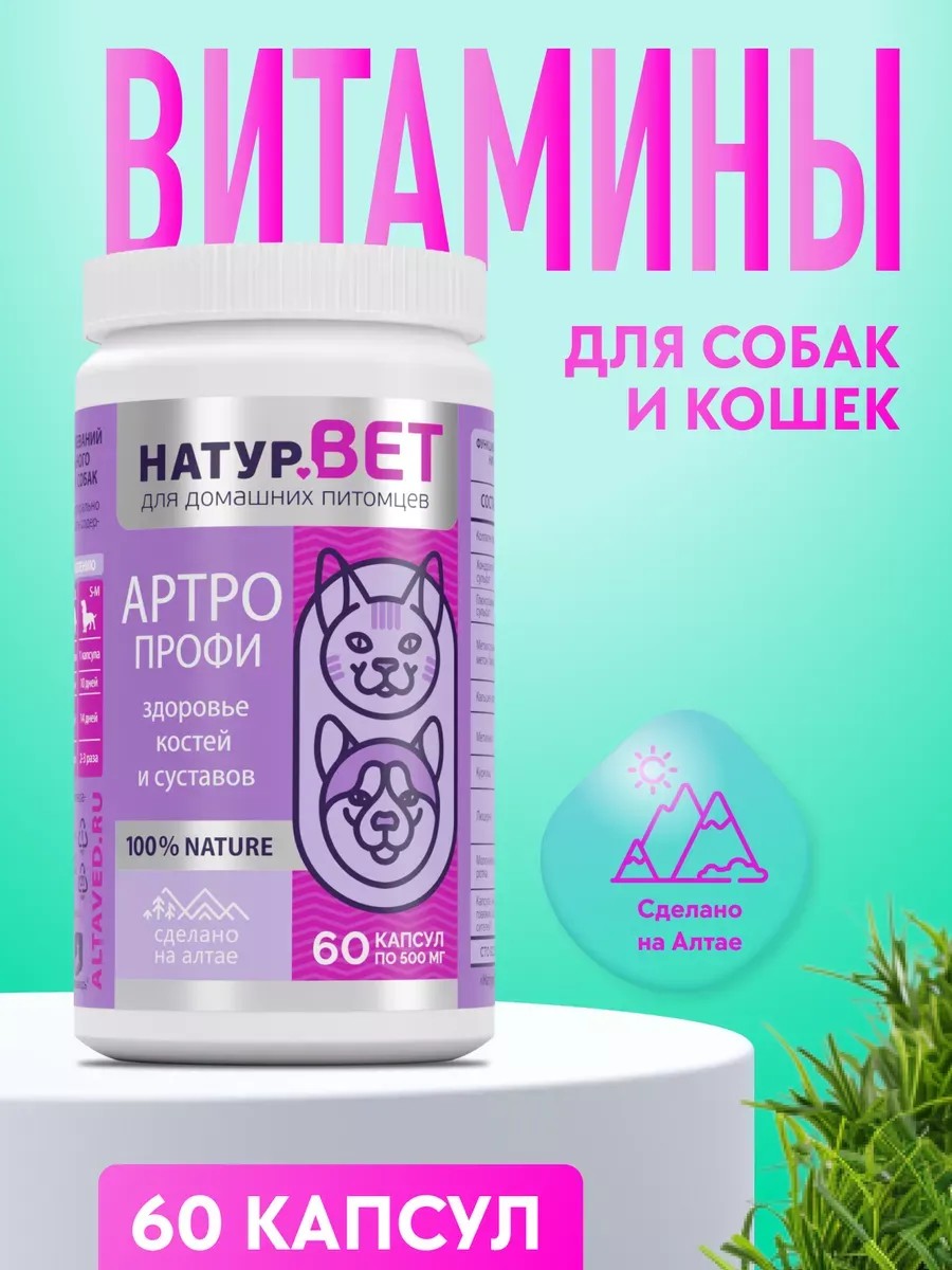 NaturVET ArthroProfi is a functional food supplement that enriches food with beneficial components to prevent joint and bone diseases. Suitable for cats and dogs of all breeds. Each bottle contains 60 capsules of 500 mg. NaturVet ArthroProfi vitamins help saturate the body with beneficial substances and strengthen cartilage, ligaments, and bones in adult animals, and also promote the growth and harmonious development of young animals. The formula contains numerous components for animal health. For example, beef collagen helps joints become stronger and more elastic. Collagen also participates in cell regeneration. Chondroitin sulfate, which influences phosphorus-calcium metabolism in cartilage tissue, is a high-molecular mucopolysaccharide. It normalizes metabolism in hyaline tissue and stimulates articular cartilage regeneration. Glucosamine sulfate strengthens cartilage tissue. It lubricates joints, relieves inflammation, and reduces pain. Methylsulfonylmethane (MSM) is involved in the production of keratin and collagen proteins, essential for healthy fur, joints, claws, and skin. The sulfur contained in MSM ensures the permeability of cell membranes and helps remove toxins and waste products from the body. Calcium carbonate optimally supports bone structure in adult dogs and cats, skeletal development, blood clotting, and maintains muscle function and protects against osteoporosis. All these components promote the strengthening and regeneration of ligaments, joints, and tendons. They prevent cartilage deterioration. They restore connective muscle and bone tissue and reduce joint pain. Administer orally or open the capsule and mix the contents with wet food. NaturVet is a natural product made from natural ingredients native to the Altai Mountains. We care for every pet in our vast country, ensuring that all furry creatures are healthy.