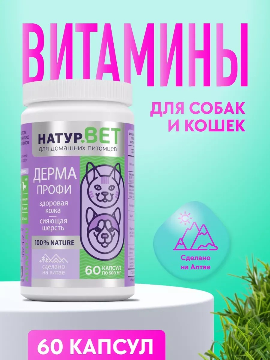 НатурВЕТ ДермаПрофи – это кормовая добавка в дополнение к основному рациону для улучшения качества шерсти и профилактики аллергических раздражений кожных покровов у собак и кошек. Витамины предназначены для взрослых кошек и собак всех пород. В баночке 60 капсул по 500 мг. Благодаря витаминам НатурВед, шерсть питомца станет шелковистой, а качество кожи заметно улучшится. В состав входит метионин, который является отличным источником серы, формирующей белок кератин. В свою очередь кератин необходим для здоровья шерсти, кожного покрова и когтей животного. Витамины группы В и витамин А - необходимы для здоровья и оптимальной работы нервной системы и нормального обмена энергии питомца. А также для повышения иммунитета и регенерации тканей. Витамин Д благоприятно влияет на прочность костей, делает суставы и мышцы крепче. Говяжий коллаген помогает коже стать прочнее и эластичнее. Кроме этого, коллаген участвует в регенерации клеток. Минералы, входящие в состав витаминов, участвуют во многих процессах организма. Кальций, фосфор и магний - поддерживают структуру скелета. Калий, хлор и натрий поддерживают кислотно-щелочной и водный баланс. Магний и калий необходим для проведения нервных импульсов. А сера для поддержания здоровья кожи, шерсти и суставов. Таурин особенно важен для кошек, так как их организм не синтезирует эту аминокислоту. Она крайне важна для здоровья зрительной, слуховой и репродуктивной систем организма. Пажитник способствует лучшему усвоению пищи, а экстракт солодки - питательных веществ. Все эти компоненты препятствуют выпадению шерсти, предупреждают шелушение кожных покровов, оказывают противовоспалительное действие и уменьшают проявление аллергических реакций, способствуют заживлению микротравм и воспалений на коже. Применять перорально или раскрыть капсулу и смешать содержимое с влажным кормом. НатурВет – натуральная продукция из природных компонентов Алтая. Мы заботимся о каждом питомце нашей огромной страны, чтобы все пушистики были здоровы.