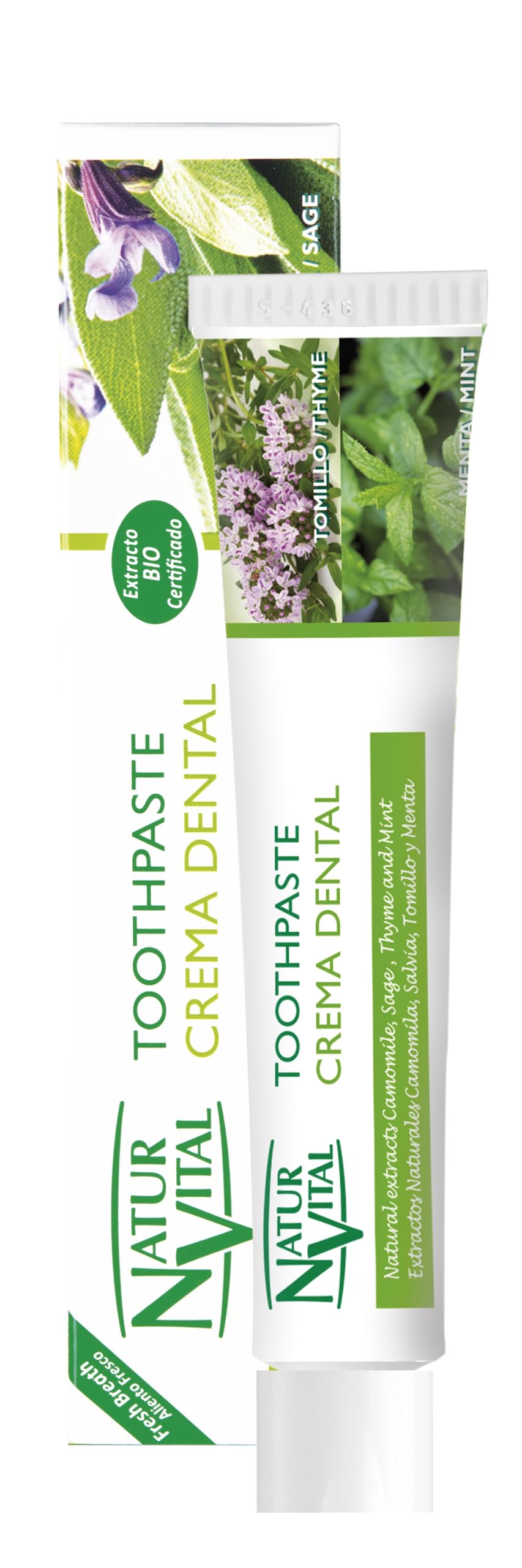 This toothpaste prevents plaque buildup, strengthens gums, and gently cleans enamel. Thanks to a combination of natural extracts of thyme, mint, chamomile, and sage, along with kaolin and fluoride, it guarantees a thorough and deep clean. This natural toothpaste is ideal for preventing dental problems. It provides a complete and deep clean for your gums and teeth, leaving your breath pleasantly fresh. Prevents plaque formation. This natural toothpaste is free of silicones and phthalates. DIRECTIONS FOR USE Apply a pea-sized amount to a toothbrush and brush for 2 minutes, twice a day. SAFETY WARNING Do not ingest. See moreEnriched with fluoride, paraben- and phthalate-free. With natural extracts of mint, chamomile, and sage, which gently cleanse and purify the oral cavity. Strengthens gums and gently cleans enamel. This toothpaste helps prevent plaque buildup.NaturVital Crème dentaire naturelle haleine fraîche aux extraits de menthe, sauge, camomille et thym 75 mlDESCRIPTION DU PRODUIT DESCRIPTION DU PRODUIT Crème dentaire qui prévient la formation de plaque dentaire, renforce les gencives et assure un nettoyage en douceur de l'émail. Grâce à la combinaison d'extraits naturels de thym, de menthe, de camomille et de sauge, ainsi que du kaolin et du fluor, ils garantissent un nettoyage complet et profond de la bouche. C'est un dentifrice naturel idéal pour prévenir les problèmes dentaires. Il apporte un nettoyage total et en profondeur sur vos gencives et vos dents, laissant une haleine fraîche très agréable. Prévient la formation de plaque. Ce dentifrice naturel ne contient ni silicones ni phtalates. MODE D'EMPLOI Appliquez une quantité de la taille d'un pois sur une brosse à dents et brossez-vous les dents pendant 2 minutes, deux fois par jour AVERTISSEMENT DE SÉCURITÉ Ne pas ingérer. Voir plusEnrichi en fluor, sans parabènes ni phtalates. Avec des extraits naturels de menthe, camomille et sauge, qui nettoient en douceur et purifient la cavité buccale. Renforce les gencives et assure un nettoyage en douceur de l'émail. Dentifrice qui prévient la formation de plaque dentaire.