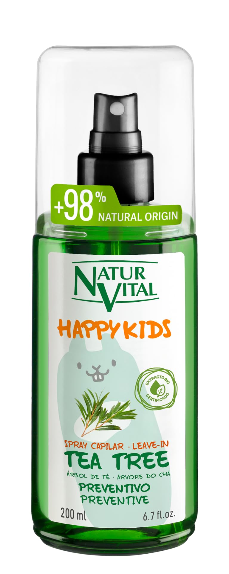Tea Tree Leave-In Hair Spray is a conditioner enriched with tea tree oil and thyme extract. This spray protects hair from small insects and also makes styling easier. It leaves hair soft, manageable, and with a refreshing scent. Contains certified organic tea tree extract, which protects the scalp and softens the hair fiber. For convenient daily use on dry or damp hair, this spray helps detangle hair while its pleasant fragrance repels insects. Ideal for school-aged boys and girls, as a complement to Tea Tree Shampoo. INGREDIENTS Tea Tree, Thyme Extract DIRECTIONS Apply to damp or dry hair and style as usual. Do not rinse. Can be used after Tea Tree Shampoo for best results. SAFETY WARNING Avoid contact with eyes. Do not use if an adverse reaction occurs. See moreHappy Kids Line: Formulas with certified organic extracts to care for the hair and scalp of little ones. With two shampoos and a conditioning spray, it's the natural alternative to children's hair care. NATURVITAL: With over 40 years of experience in the natural beauty sector and an environmentally conscious work philosophy, NaturVital offers the benefits of nature through the finest products. Directions for use: Apply to wet or dry hair and style as usual. Do not rinse. For best results, follow with Happy Kids Tea Tree Shampoo during washing. Ingredients: Organic tea tree extract and organic thyme extract. Free from parabens, silicones, phthalates, colorants, cocamide DEA, and PEGs. Natural care: Gentle, hypoallergenic, leave-in spray for daily use. Formulated with natural tea tree extract and containing over 98 natural ingredients. Children's conditioner: Suitable for boys and girls, this conditioner helps detangle and add shine to hair, contributing to easy styling and soft, loose, and shiny hair.NaturVital - Spray démêlant Tea Tree Happy Kids pour enfants pour garçons et filles avec Tea Tree de culture bio certifié, naturel et hypoallergénique, sans parabens, colorants ni silicones, 200 mlDESCRIPTION DU PRODUIT DESCRIPTION DU PRODUIT Spray capillaire sans rinçage Tea Tree est un conditionneur enrichi en huile de thé et extrait de thym. Ce spray protège les cheveux des petits insectes et facilite également le coiffage. Laisse les cheveux doux, maniables et avec un parfum rafraîchissant. Contient de l'extrait de Tea Tree issu de culture biologique certifiée, qui protège le cuir chevelu et adoucit la fibre capillaire. Pour une utilisation confortable au quotidien sur cheveux secs ou humides, ce spray aide à démêler les cheveux tandis que son parfum agréable agit en éloignant les insectes. Idéal pour les garçons et les filles d'âge scolaire, en complément du shampooing Tea Tree. INGRÉDIENTS Tea Tree, extrait de thym MODE D'EMPLOI Appliquer sur cheveux humides ou secs et coiffer comme d'habitude. Ne pas rincer. Peut être utilisé après le shampooing Tea Tree pour un meilleur résultat. AVERTISSEMENT DE SÉCURITÉ Éviter tout contact avec les yeux. Évitez l'utilisation en cas de réaction défavorable Voir plusLigne Happy Kids : formules aux extraits biologiques certifiés pour prendre soin des cheveux et du cuir chevelu des plus petits. Avec deux shampooings et un spray revitalisant, c'est l'alternative naturelle aux soins capillaires pour enfants. NATURVITAL: Avec plus de 40 ans d'expérience dans le secteur de la beauté naturelle et une philosophie de travail respectueuse de l'environnement, NaturVital offre les bienfaits de la nature grâce aux meilleurs produits. Mode d'emploi : appliquer sur cheveux humides ou secs, et coiffer comme d'habitude. Ne pas rincer. Pour plus d'efficacité, complétez le soin avec le shampooing Happy KidsTea Tree lors des lavages. Ingrédients : extrait biologique de Tea Tree et extrait biologique de thym. Ne contient pas de parabènes, de silicones, de phtalates, de colorants, de cocamide DEA et de PEG. Soin naturel : spray sans rinçage, doux, hypoallergénique et pour une utilisation quotidienne. Il est formulé avec de l'extrait naturel de Tea Tree et contient plus de 98 d'ingrédients naturels. Après-shampoing pour enfants : indiqué pour les garçons et les filles, cet après-shampoing aide à démêler et à faire briller les cheveux, contribuant à un coiffage facile et à des cheveux doux, lâches et brillants.