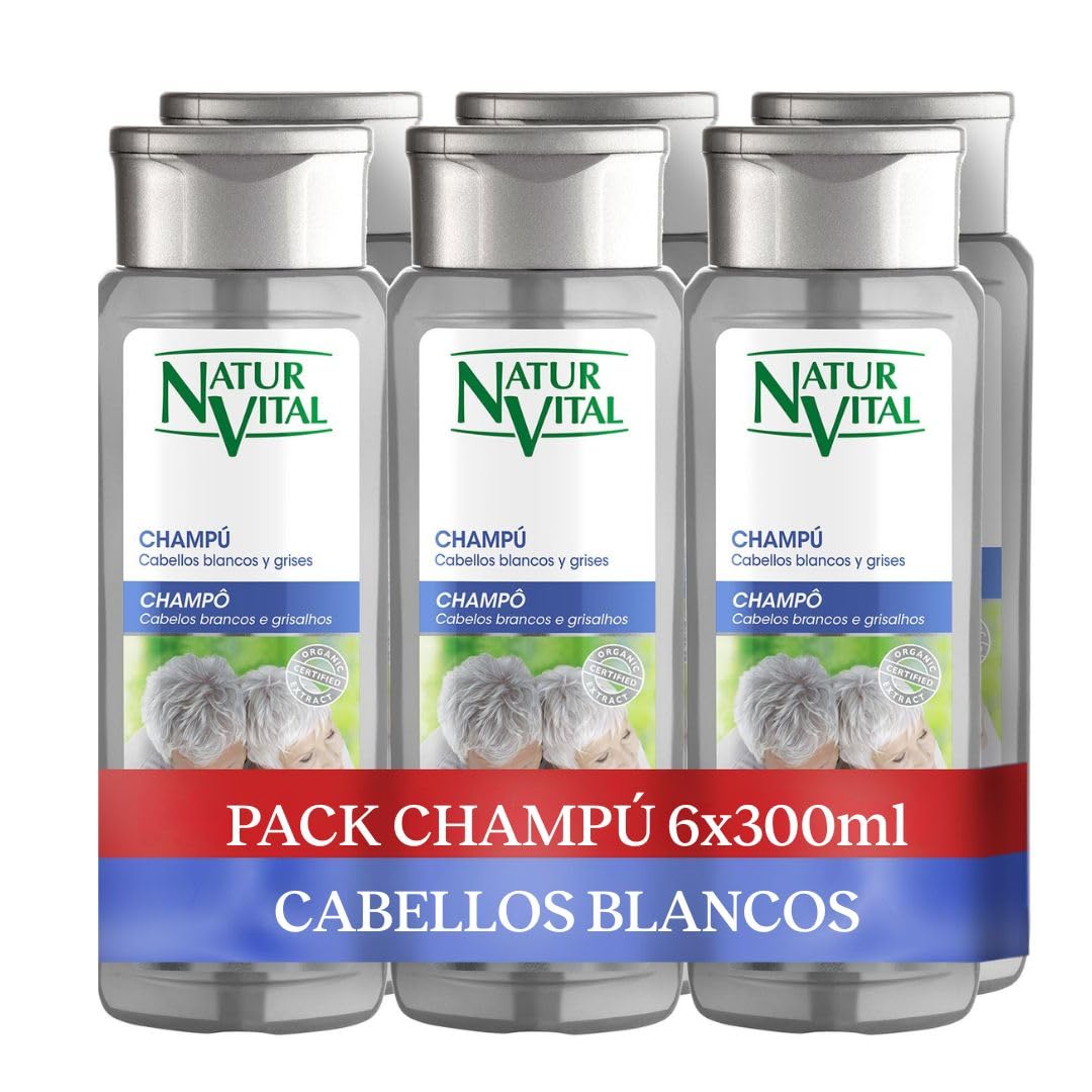 Silver Shampoo, thanks to its bluish tint, eliminates yellow and orange tones, giving hair a silvery hue. Its plant-based surfactants allow for gentle washing. It is frequently used. Its formula contains certified organic blueberry extract, rich in antioxidants, and blue pigments, which optically neutralize yellowing. It also includes henna extract, which helps restore the hair's natural shine, and provitamin B5. It is free of parabens and phthalates. It works on white or gray hair by neutralizing yellow tones caused by oxidation and imparting a silvery tint. Ideal for those who want to care for their gray hair and make it more attractive. It is very easy to apply it washes and colors in one step: simply distribute it through damp hair with a light massage. Leave on for three minutes (and a maximum of five minutes) and rinse thoroughly with water. The NaturVital Silver line includes a mask to enhance the effect and beautify gray hair. The toning effect is gradual, without the risk of leaving a bluish tint on the hair. It won't stain your hands if the instructions are followed, and you don't need to wear gloves. However, if any residue remains, it can be easily removed with soap and water. The packaging is made of 100 recycled and recyclable PET plastic, helping to conserve environmental resources. The NaturVital (Nature and Life) brand produces solar energy in its own facilities to power the manufacturing of its products, making this shampoo made with clean energy. INGREDIENTS Blueberry, henna DIRECTIONS Apply to wet hair, massaging gently. Leave on for a few minutes and rinse thoroughly with water. SAFETY WARNING For external use only. Avoid contact with eyes. See moreUnisex shampoo: Suitable for men and women with white or gray hair. Directions for use: It is recommended to use 1 to 2 times per week, distributing the product through wet hair and massaging gently. Leave on for 3 minutes and rinse thoroughly with water. Natural ingredients: Its formula contains certified organic blueberry extract, henna extract, and provitamin B5. Paraben and phthalate free. Benefits: Moisturizes and softens hair, helping it regain its natural shine. Silver shampoo: Its bluish color works on white or gray hair, neutralizing yellow tones caused by oxidation and providing a silver tint.NaturVital Lot de 6 shampooings argentés, sans parabènes, naturels, cheveux blancs et gris, matifiant les cheveux gris platine, pigment bleu, pour homme et femme, 6 x 300 ml 300 ml (Paquete de 6) 6DESCRIPTION DU PRODUIT DESCRIPTION DU PRODUIT Le shampooing Silver, grâce à sa couleur bleutée, élimine les tons jaunâtres et orangés, donnant une teinte argentée aux cheveux. Ses tensioactifs d'origine végétale permettent un lavage doux des cheveux. Il est fréquemment utilisé. Sa formule contient de l'extrait de myrtille certifié biologique, riche en antioxydants, et une pigmentation de tons bleus, ce qui permet d'éliminer optiquement le jaunissement des cheveux. Comprend également de l'extrait de henné qui aide à restaurer l'éclat naturel des cheveux et de la provitamine B5. Ne contient ni parabènes ni phtalates. Agit sur vos cheveux blancs ou blancs en neutralisant les tons jaunâtres des cheveux causés par l'oxydation et en apportant une teinte argentée. Idéal pour les personnes qui veulent prendre soin de leurs cheveux gris et les rendre plus attrayants. Son application est très facile, il lave et teint la couleur en un seul geste : il se répartit sur cheveux humides en massant légèrement. Laisser agir pendant trois minutes (et au maximum cinq minutes) et rincer abondamment à l'eau. La ligne Silver de NaturVital dispose d'un masque pour renforcer l'effet et embellir les cheveux blancs. L'effet nuancier est progressif, sans risque de laisser une teinte bleutée sur les cheveux. Ne tache pas les mains si les instructions sont suivies et vous n'avez pas besoin de porter des gants, mais s'il reste des résidus, ils sont facilement éliminés avec de l'eau et du savon. Son emballage est composé de plastique PET 100 recyclé et recyclable, contribuant à préserver les ressources de l'environnement. La marque NaturVital (Nature et Vie) produit de l'énergie solaire dans ses propres installations pour alimenter la fabrication de ses produits, ce qui en fait un shampooing élaboré avec de l'énergie propre. INGRÉDIENTS Myrtille, henné MODE D'EMPLOI Appliquer sur cheveux humides en massant légèrement. Laisser agir quelques minutes et rincer abondamment à l'eau. AVERTISSEMENT DE SÉCURITÉ Pour usage externe uniquement. Éviter tout contact avec les yeux. Voir plusShampoing unisexe : convient aux hommes et aux femmes aux cheveux blancs ou blancs. Mode d'emploi : il est recommandé d'utiliser 1 à 2 fois par semaine, en répartissant le produit sur cheveux humides et en donnant un léger massage. Laisser agir 3 minutes et rincer abondamment à l'eau. Ingrédients naturels : sa formule contient de l'extrait de myrtille de culture biologique certifiée, de l'extrait de henné et de la provitamine B5. Ne contient ni parabènes ni phtalates. Avantages : hydrate et adoucit les cheveux, les aidant à retrouver leur brillance naturelle. Shampoing argenté : sa couleur bleutée agit sur les cheveux blancs ou blancs, neutralisant les tons jaunâtres causés par l'oxydation et apportant une teinte argentée.