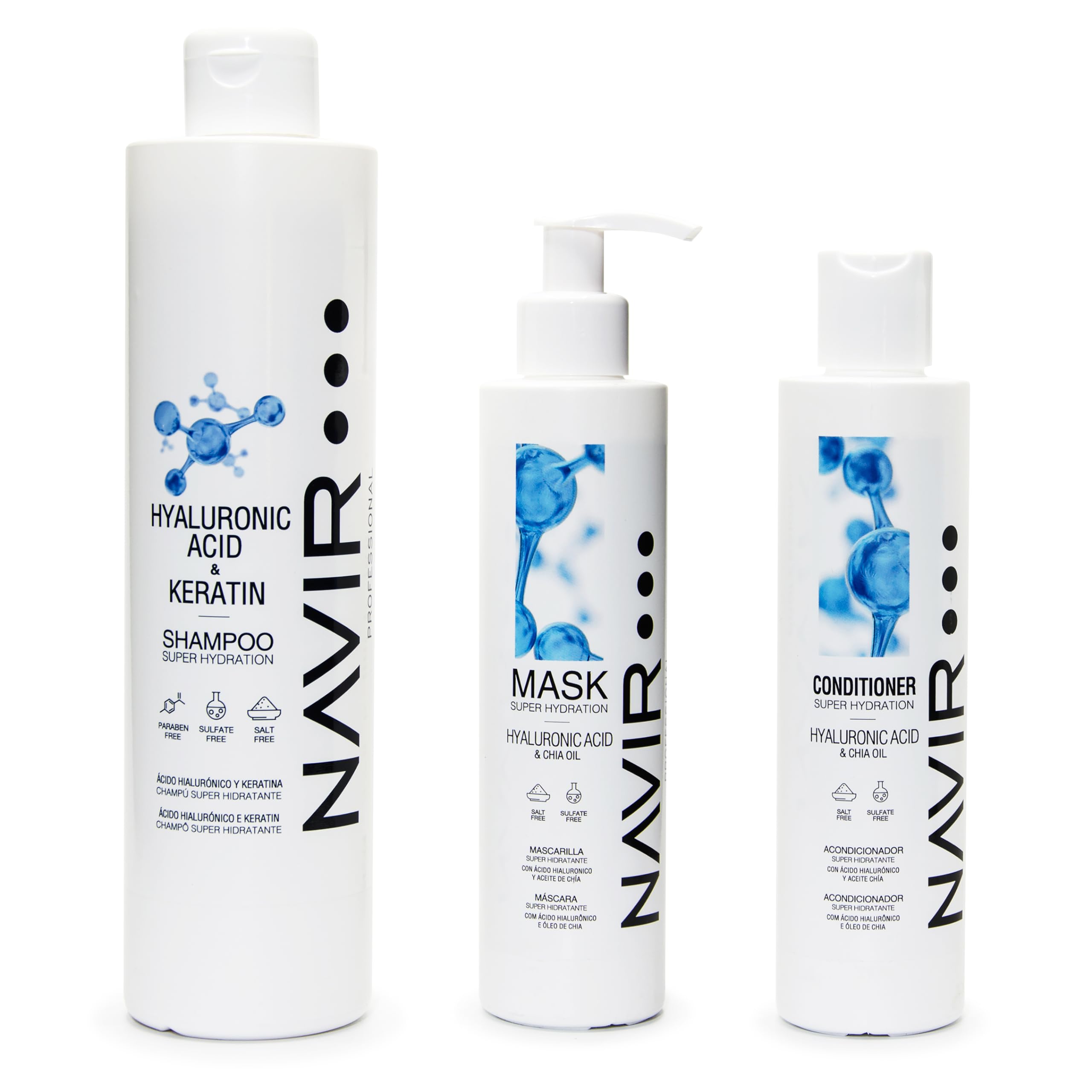 NAVIR Professionnel Coffret professionnel cheveux à l'acide hyaluronique – Shampoing Masque Après-shampooing – Routine hydratante complète – Sans sulfates, sans parabènes, sans sels – 3 produits