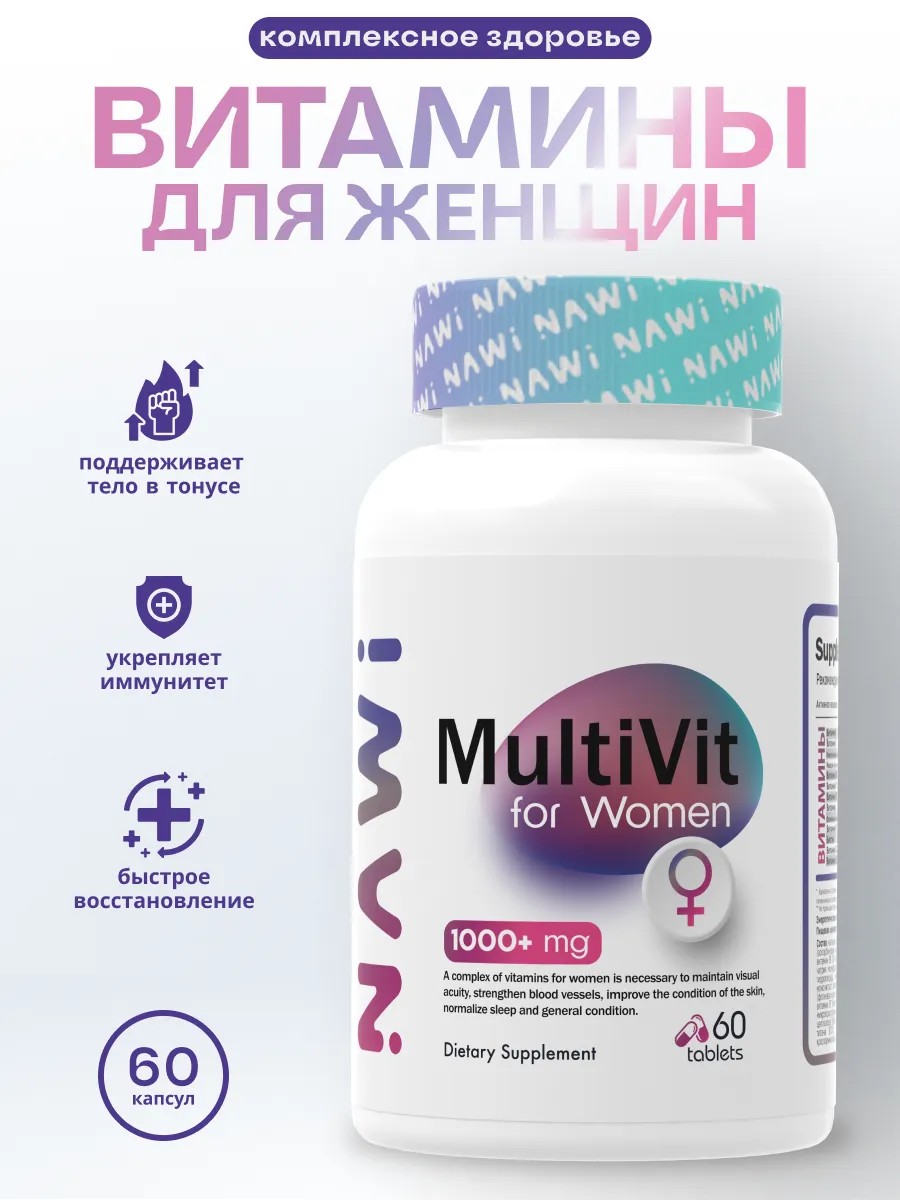 The vitamin and mineral complex NAWI MultiVit for Women 60 tabs is used to strengthen and prevent the immune system, support the heart and blood vessels, improve brain and nervous system function, support the musculoskeletal system, protect against hair loss and skin aging, speed up recovery after physical activity, improve metabolism and reduce subcutaneous fat levels.