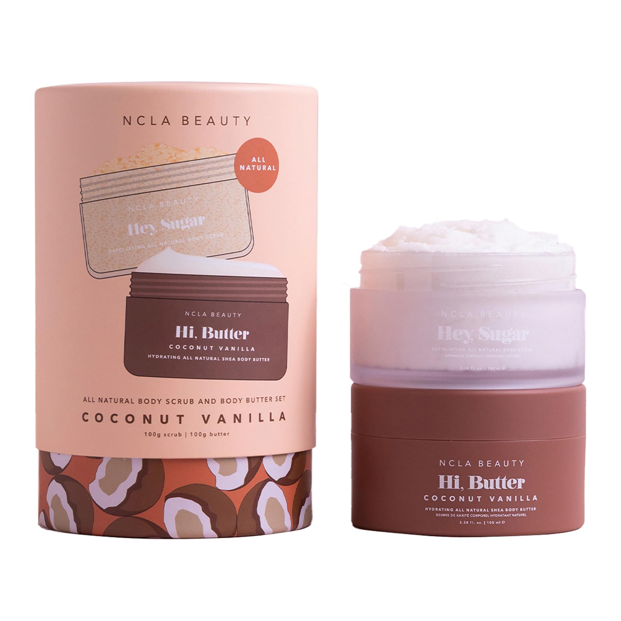 NCLA Beauty All Natural Body Scrub and Body Butter - Exfoliating Sugar Scrub and Moisturizer with Natural Butters and Oils - Coconut Vanilla - 2 pc