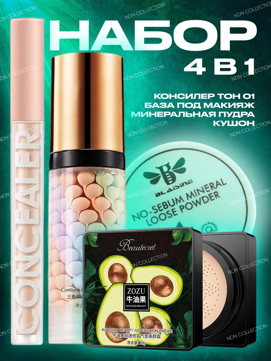 Представляем вашему вниманию идеальный набор косметики для создания безупречного макияжа. В этом наборе вы найдете все необходимые продукты для подготовки, коррекции и завершения вашего образа: : 1. База под макияж - создает идеальную основу для нанесения макияжа, увлажняет кожу и удлиняет стойкость макияжа. 2. Тональный крем-кушон для лица (BB-крем) в комплекте со спонжем - увлажняет, питает и матирует кожу лица, идеально перекрывает тёмные круги под глазами, убирает покраснения на лице, пигментацию и другие несовершенства. 3. Консилер - позволяет быстро скрыть темные круги под глазами, синяки, прыщи, веснушки, покраснения и морщины, придает коже ровный тон и сияющий вид. 4. Пудра - рассыпчатая и увлажняющая пудра поможет вам не только привести кожу вашего лица и тела в порядок и избавиться от недостатков, но и сохранять результат на протяжении долгого времени. Отлично показывает себя в борьбе против пигментных пятен, для создания контуринга и сохранения первозданной красоты вашей кожи. Этот набор косметики станет незаменимым помощником в создании вашего идеального образа, придавая вашему лицу свежий и безупречный вид в любое время дня и на любом мероприятии.