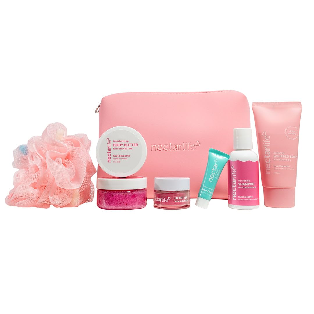 PERFECT GIFT READY POUCH Comes in a cute reusable to go pouch that makes gifting simple for holidays, birthdays or self care surprises. NOURISHES FROM HEAD TO TOE Cleanses, exfoliates, moisturizes and refreshes with formulas that leave skin soft, smooth and radiant all day. TSA APPROVED TRAVEL SIZES Perfect for flights, weekend trips, gym bags or your daily purse. Easy to pack, easy to use and made for life in motion. SEVEN MUST HAVE PRODUCTS INSIDE Includes Fruit Smoothie Whipped Soap, Body Scrub, Body Butter, Shampoo, Strawberry Lip Butter, Ultra Hydrating Face Cream sample and a pink loofah. COMPLETE ON THE GO SELF CARE SET A travel friendly kit with all your daily essentials in mini sizes for glowing skin and hair wherever you are.