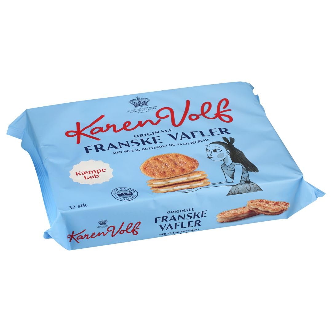 Scandinavian Coffee Table - Packaged. With Karen Volf Franske Vafler (427 g), you can bring a classic Danish pastry home. The delicate, crispy layers of waffle puff pastry provide just the right mix of bite and texture that pairs easily with coffee and tea. Whether for Sunday fika, as a small dessert after a meal, or for a spontaneous visit, Franske Vafler are ready to eat and serve in seconds. It's that simple: open the package, arrange the pastries decoratively on a tray – and you're done. For a quick dessert twist, combine the Vafler with fresh berries, a dollop of cream, vanilla ice cream, or light custard. Even on buffets or as a sweet element at brunch, these pastries add variety: crispy, delicate, and visually appealing – without any baking effort. Your benefits at a glance: 427g of fine Danish pastries – ideal for sharing and serving. Crispy layers with a classic pastry aroma. Ready to serve – zero preparation, maximum impact. Versatile: coffee maker, dessert brick, brunch highlight. Proven Karen Volf brand quality. Important: Recipes may contain allergens. Please remove ingredients, allergens, and nutritional information from the original packaging. Store in a cool, dry place away from light close tightly after opening. INGREDIENTS: Wheat flour, margarine (palm oil, water, rapeseed oil, salt), emulsifiers (E471, E475), sugar, vegetable fat (palm, rapeseed), dextrose, natural flavoring (vanilla), salt, vanilla bean. May contain traces of soy and hazelnuts.Karen Volf Franske Vafler 427 g Pâtisserie danoise de style gaufre pâte feuilletée Croustillante et fine Prêt à manger Idéal pour le café et le dessert Spécialité scandinaveDESCRIPTION DU PRODUIT DESCRIPTION DU PRODUIT Table basse scandinave - En paquet Avec Karen Volf Franske Vafler (427 g), vous apportez une pâtisserie danoise classique à la maison. Les couches délicates et croustillantes de style gaufré pâte feuilletée fournissent exactement le mélange de morsure et de finesse qui s'accorde facilement avec le café et le thé. Que ce soit pour la fika du dimanche, comme petit dessert après le repas ou lors d'une visite spontanée, les Franske Vafler sont prêts à manger et servis en quelques secondes. C'est aussi simple que cela : ouvrez le paquet, disposez des pâtisseries sur un plateau de manière décorative – c'est prêt. Pour une torsion rapide du dessert, combinez le Vafler avec des baies fraîches, un peu de crème, de la glace vanille ou une crème légère. Même sur les buffets ou comme élément sucré au brunch, les pâtisseries apportent de la variété : croustillantes, fines et visuellement accueillantes – sans effort de cuisson. Vos avantages en un coup d'œil 427 g de pâtisseries danoises fines – Idéal pour partager et servir Couches croustillantes avec un arôme de pâtisserie classique Prêt à servir – Préparation zéro, effet maximal Polyvalent : cafetière, brique de dessert, point fort du brunch Qualité éprouvée de la marque Karen Volf Important : les recettes peuvent contenir des allergènes. Veuillez retirer les ingrédients, les allergènes et les valeurs nutritionnelles de l'emballage d'origine. Conserver au sec, au frais et à l'abri de la lumière bien fermer après ouverture. INGRÉDIENTS farine de blé, margarine (huile de palme, eau, huile de colza, sel), émulsifiants (E471, E475), sucre, végétal. Graisse (palme, colza), dextrose, arôme naturel (vanille), sel, grain de vanille. Peut contenir des traces de soja et de noisettes