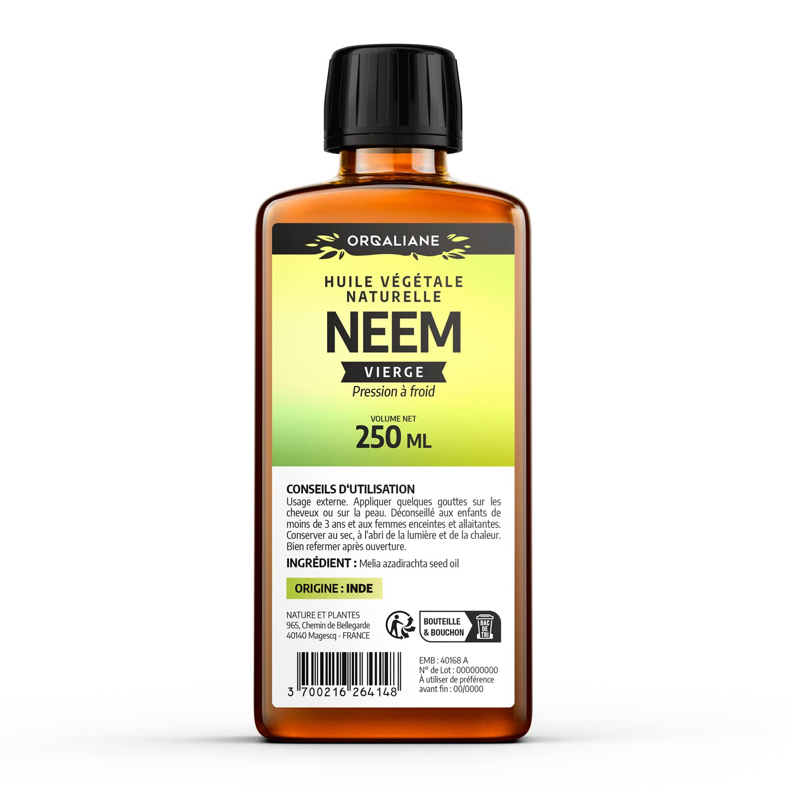 Hair: Add a few drops to your regular shampoo or make an oil bath by mixing virgin olive oil and neem oil. Skin: You can apply it pure on your face or add a few drops of essential oil. External use. 1st cold pressing. 100 Neem Oil (Melia azadirachta seed oil).Cheveux : ajoutez quelques gouttes dans votre shampooing habituel ou faire un bain d'huile en mélangeant de l'huile d'olive vierge et de l'huile de neem. Peau : vous pouvez l'appliquer pure sur votre visage ou ajoutez quelques gouttes d'huile essentielle. Usage externe. 1ère pression à froid. 100 Huile de Neem (Melia azadirachta seed oil).