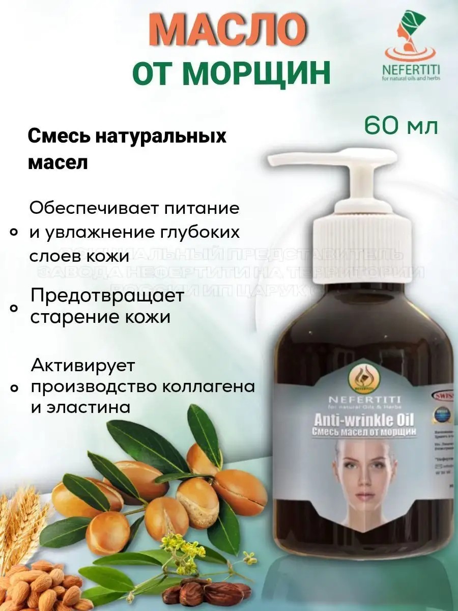 Смесь масел от морщин. Натуральные египетские масла холодного отжима. Бренд: Nefertiti for natural oils and herbs. Страна производитель: Египет. Cостав: аргановое масло, масло жожоба, масло миндаля, масло сандала, масло семян моркови, масло зародышей пшеницы, миндальное масло, натуральные эфирные масла.