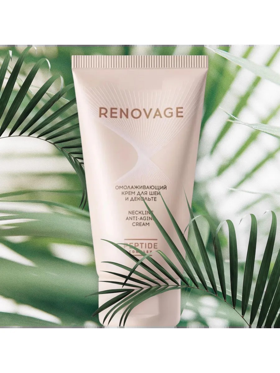 Омолаживающий крем для шеи и декольте Renovage на основе пяти умных пептидов глубоко увлажняет и разглаживает нежную кожу столь деликатных частей женского тела.
