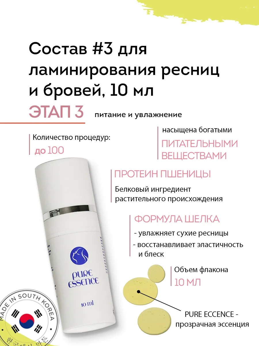 Состав 3 представляет собой прозрачную эссенцию, которая применяется на третьем этапе долговременной укладки бровей и ламинирования ресниц. Это первый шаг к глубокому восстановлению белковых структур волоска. Эссенция обволакивает каждый волосок, закрепляя результат на весь период носки, обеспечивая глубокое проникновение питательных веществ и увлажняя волоски от корней до кончиков. Закрепляющий компонент в составе 3 помогает сохранить пигмент и полезные вещества внутри каждого волоска надолго.