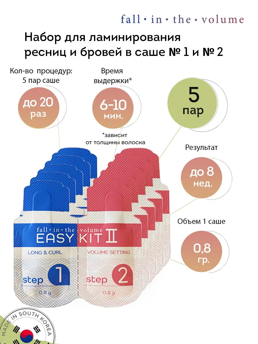 Набор в саше FALL IN THE VOLUME состоит из состава № 1 и № 2 для профессионального ламинирования ресниц и долговременной укладки бровей. Эффект после процедуры сохраняется до 8 недель!