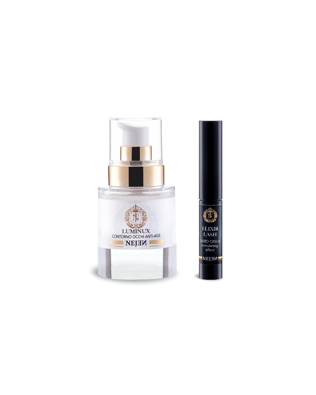 Rediscover the freshness and definition of your eyes with the perfect duo: Lush Luminux Eye Cream and Elixir Eyelash Serum. The eye cream relaxes, brightens, and reduces puffiness and dark circles, while the eyelash serum strengthens and stimulates growth, giving a natural, voluminous effect. Thanks to the synergy of caffeine, peptides, and botanical actives, this treatment reduces signs of fatigue and makes your eyes look more open and intense. Ideal for those who want bright eyes and fuller lashes, without the need for makeup. INDICATIONS Tired and stressed eye area and sparse lashes SAFETY WARNING Cosmetic product for external use only. Do not swallow. Apply to intact, unbroken skin. Not suitable for people allergic to one or more ingredients. Keep out of reach of children. The expiry date refers to the product when kept sealed at a temperature between 17 and 22 C and stored away from light and heat sources. See morePractical application: Ideal for daily use, it absorbs quickly and can be used both morning and evening for optimal results. Strengthened lashes: Lush Elixir Serum promotes the natural growth of lashes, making them stronger, longer, and thicker thanks to a combination of nourishing active ingredients. Deep hydration: Hyaluronic acid improves the elasticity of the peri-ocular area and keeps the skin hydrated, reducing signs of fatigue. Advanced formula: Luminux Eye Cream is enriched with caffeine, peptides, and botanical actives to visibly reduce puffiness, wrinkles, and dark circles, giving a fresher, more rested look. Dual action: An intensive 2-in-1 treatment that combines a regenerating eye cream and a strengthening lash serum.Nejen Intense Beauty Box, Traitement avec contour des yeux liftant et sérum Cils fortifiant et nourrissantDESCRIPTION DU PRODUIT DESCRIPTION DU PRODUIT Retrouve la fraîcheur et la définition du regard avec le duo parfait : le contour des yeux Luminux et le sérum cils Elixir Lush. Le contour des yeux détend, illumine et réduit les poches et les cernes, tandis que le sérum des cils fortifie et stimule la croissance, donnant un effet naturel et volumineux. Grâce à la synergie entre la caféine, les peptides et les actifs botaniques, ce traitement réduit les signes de fatigue et rend le regard plus ouvert et intense. Idéal pour ceux qui veulent des yeux lumineux et des cils plus pleins, sans besoin de maquillage INDICATIONS Contour des yeux fatigué et stressé et cils clairsemés AVERTISSEMENT DE SÉCURITÉ Produit cosmétique pour usage extérieur, ne pas avaler. Appliquer sur peau intégrée et sans blessures. Ne convient pas aux personnes allergiques à un ou plusieurs composants. Tenir hors de portée des enfants. La date d'expiration se réfère au produit conservé scellé à une température comprise entre 17 et 22 C et placé à l'écart des sources de lumière et de chaleur. Voir plusApplication pratique : idéal pour un usage quotidien, il s'absorbe rapidement et peut être utilisé aussi bien le matin que le soir pour des résultats optimaux. Cils renforcés : le sérum Elixir Lush favorise la croissance naturelle des cils, les rendant plus forts, longs et épais grâce à une combinaison d'actifs nutritifs. Hydratation profonde : l'acide hyaluronique améliore l'élasticité de la zone périoculaire et maintient la peau hydratée, réduisant les signes de fatigue. Formule avancée : le contour des yeux Luminux est enrichi en caféine, peptides et actifs botaniques pour réduire visiblement les sacs, rides et cernes, donnant un regard plus frais et reposé. Double action : traitement intensif 2-en-1 qui combine un contour des yeux régénérant et un sérum fortifiant pour cils.
