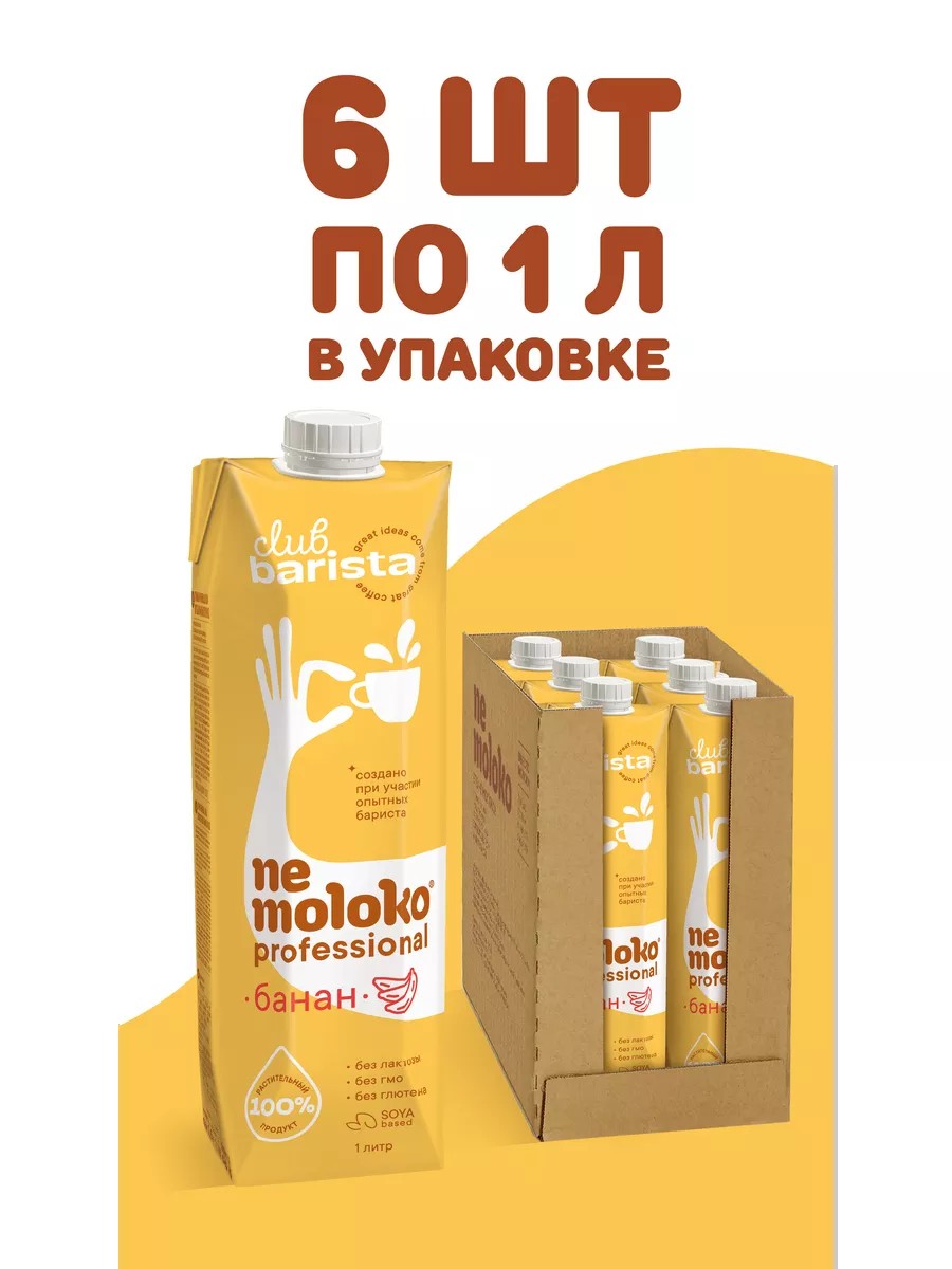 Nemoloko Professional соевое с бананом – растительный напиток, с приятным вкусом банана разнообразит ваш латте или капучино.