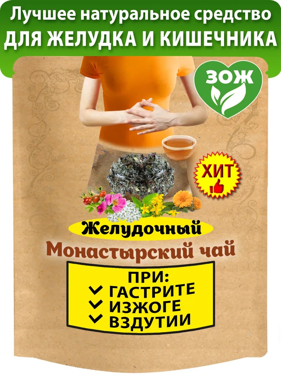 Чай для желудка и кишечника мягко воздействует на органы ЖКТ и избавляет от неприятных симптомов (изжога, тошнота, вздутие, колики, метеоризм, спазмы в животе) и причин их появления. В состав входят 8 целебных трав: 1) Календула - помогает при колите, гастрите, язве желудка. 2) Семя льна - нормализуют кислотность желудочного сок. 3) Плоды шиповника - нейтрализуют воспалительные процессы, нормализуют работу печени. 4) Зверобой - обладает антисептическим, обезболивающим и противовоспалительным действием. 5) Сушеница топяная - стимулирует перистальтику кишечника. 6) Мята перечная - снижает болевые ощущения, облегчает состояние при обострении. 7) Хвощ полевой - усиливает эффективность остальных компонентов. 8) Цветы тысячелистника - помогают при кровотечениях и внутренних кровоизлияниях. Таблетки для желудка от гастрита, лекарства для кишечника и от боли в желудке, БАДы, аптечные препараты - не все хотят принимать, так как у них много побочных эффектов. Наша компания специализируется на продаже товаров, которые имеют исключительно натуральный состав. К ним относятся все монастырские чаи. Травяные сборы всегда славились тем, что у них высокая эффективность и при этом минимум противопоказаний. Монастырский желудочный чай заваривают из расчета 1 ст. л. на 200 мл кипятка. Имеет горчинку во вкусе, поэтому лучше его употреблять вместе с медом. Желудочно кишечный сбор. Не является лекарством.