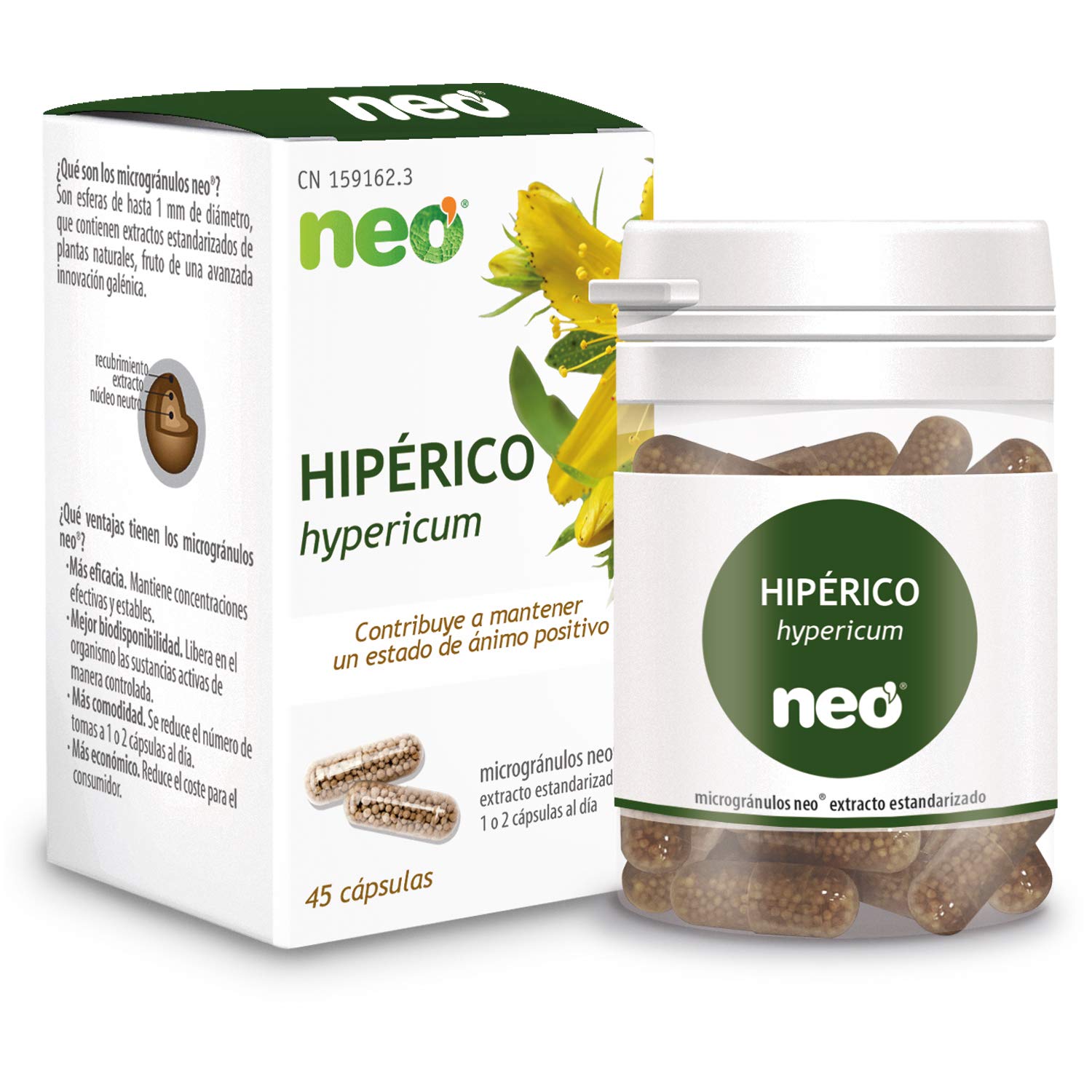St. John's wort is a shrub native to Europe, belonging to the Hypericaceae family, and is the most abundant species in this family. Its name comes from the property attributed to this herb to ward off evil spirits and apparitions. The flowers were hung on religious icons on St. John's Day. The active part of this shrub is the flowering tops, which contain naphthodiantrones, primarily hypericin, pseudohypericin, and isohypericin, the first being the most active and the standardized form. It also contains flavonoids, bisflavones, caffeic acid derivatives, proanthocyanidins, phytosterols, hyperforin, and coumarins, among others. INGREDIENTS Dry extract of St. John's wort (Hypericum perforatum L.) flowering tops standardized to 0.3 hypericin 200mg, bulking agent (cellulose), vegetable capsule (pululane), sweetener (xilitol), carrier (shellac), anti-caking agent (talc) SAFETY WARNING Take 1 or 2 capsules daily. Do not exceed the recommended daily dose. Formulated without gluten or dairy derivatives. Suitable for celiacs and those with lactose intolerance. Allergen-free, GMO-free, and free of nanomaterials. Store in a cool, dry place out of reach of children. Food supplements should not be used as a substitute for a varied and balanced diet. See moreAttention to our customers: Neovital Health provides you with the best pharmaceutical team, working daily with the utmost scientific rigor to contribute to the well-being of society by combining nature and innovation. We are constantly studying new applications of natural active ingredients that can address a wide range of health needs. If you have any questions about our products, please contact us. We are here to help! Who are we? Neovital Health is a Spanish company with an international reach, committed to developing natural solutions to improve people's health. We focus all our efforts on product innovation and the effectiveness of our natural preparations, with the primary goal of helping and improving people's quality of life. For over 30 years, Neovital has been a leader in the food supplement sector and is present in thousands of Spanish pharmacies. Composition per capsule: Dry extract of flowering tops of St. John's wort (Hypericum perforatum L.) standardized to 0.3 hypericin 200 mg, bulking agent (cellulose), vegetable capsule shell (pululane), sweetener (xylitol), carrier (shellac), anti-caking agent (talc). Directions for use: Take 1 or 2 capsules daily. Do not exceed the recommended daily dose. Formulated without gluten or dairy derivatives. Suitable for celiacs and those with lactose intolerance. Allergen-free, GMO-free, and free of nanomaterials. Store in a cool, dry place, out of reach of children. Food supplements should not be used as a substitute for a varied and balanced diet. Microgranule capsules with hypertherapy extract: St. John's wort is a plant indicated for the treatment of mild anxiety, mental and physical fatigue, dementia, sadness, or sleep disturbances. Warning: If symptoms persist over time, consult a specialist.NEO Extrait de suggestions Florides de millepertuis 45 gélules avec microgranulés Aide à améliorer l'État d'Encouragement, la Nervosité et la fatigue physique et mentaleDESCRIPTION DU PRODUIT DESCRIPTION DU PRODUIT Le millepertuis est une plante arbuste d'origine européenne de la famille des hypéricacées, l'espèce la plus abondante de cette famille. Son nom vient de la propriété attribuée à cette herbe de faire fuir les mauvais esprits et les apparitions. Les fleurs étaient suspendues sur les icônes religieuses le jour de la Saint-Jean. La partie active de cet arbuste sont les sommités fleuries, qui contiennent des naphtodiantrones, principalement de l'hypéricine, de la pseudohypéricine et de l'isohypéricine, la première étant la plus active, et dont elle est standardisée. Contient également des flavonoïdes, des bisflavones, des dérivés de l'acide caféique, des proanthocyanidols, des phytostérols, de l'hyperforine et des coumarines, entre autres. INGRÉDIENTS Extrait sec de sommités fleuries de millepertuis (Hypericum perforatum L.) standardisé à 0,3 en hypericine 200mg, agent de charge (cellulose), enveloppe végétale (pululane), édulcorant (xilitol), transporteur (gomme laque), antiagrégant (talc) AVERTISSEMENT DE SÉCURITÉ Prendre 1 ou 2 gélules par jour. Ne pas dépasser la dose journalière recommandée. Élaboré sans gluten ni dérivés laitiers. Convient aux coeliaques et intolérants au lactose. Sans allergènes, sans GMO ni nanomatériaux. Conserver dans un endroit frais et sec, hors de portée des enfants. Les compléments alimentaires ne doivent pas être utilisés comme substituts à un régime diversifié et équilibré. Voir plusAttention au client : Neovital Health met à votre disposition la meilleure équipe pharmaceutique qui travaille chaque jour avec la plus grande rigueur scientifique pour contribuer au bien-être de la société en alliant nature et innovation. Là où on étudie sans cesse de nouvelles applications des principes actifs naturels qui peuvent répondre à un large éventail de besoins de santé. Si vous avez des questions sur les produits, contactez-nous et demandez-nous. Nous sommes là pour vous aider !. Qui sommes-nous ? Neovital Health est une entreprise espagnole avec une projection internationale, qui s'engage à développer des solutions naturelles pour améliorer la santé des personnes. Il concentre tous ses efforts sur l'innovation de ses produits et l'efficacité de ses préparations naturelles, avec l'objectif principal d'aider et d'améliorer la qualité de vie des gens. Neovital est depuis plus de 30 ans en tant que leader du secteur des compléments alimentaires et est présent dans des milliers de pharmacies espagnoles. Composition par capsule : extrait sec de sommités fleuries de millepertuis (Hypericum perforatum L.) standardisé à 0,3 en hypericine 200 mg, agent de charge (cellulose), enveloppe végétale (pulula