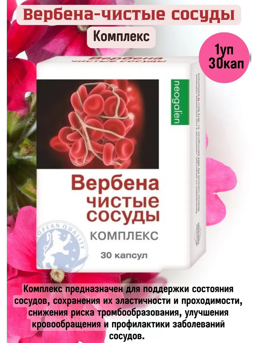 Вербена чистые сосуды комплекс - это биологически активная добавка, содержащая 30 капсул. Комплекс предназначен для поддержки состояния сосудов, сохранения их эластичности и проходимости, снижения риска тромбообразования, улучшения кровообращения и профилактики заболеваний сосудов. В состав Вербены чистые сосуды входят натуральные компоненты - витамин С, экстракты вербены и листьев гинкго билоба. Принимать капсулы следует в соответствии с инструкцией, находящейся внутри упаковки.