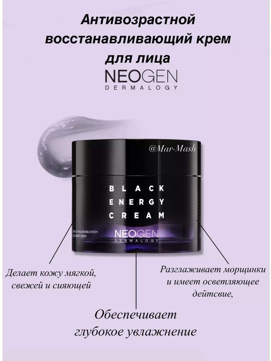 Neogen Dermalogy Black Energy Cream, a moisturizing anti-wrinkle cream with a unique formula enriched with 119 intensely moisturizing, nourishing and soothing natural active ingredients, helps restore and strengthen the skin's protective functions, smoothes wrinkles and has a brightening effect. This anti-aging face cream fills the skin with vital energy, making it radiant and elastic. This Korean lifting cream has a light gel consistency, is quickly absorbed and instantly saturates the skin with life-giving moisture and nutrients. The main active ingredients of the day cream: 1. Black Complex of extracts (extracts of black rice, black soybeans and more than 28 other "black" extracts) heal the skin and restore its hydro-lipid balance; 2. Ceramide NP helps retain moisture by strengthening the skin's protective barrier; 3. Hyaluronic acid provides deep maximum hydration, saturates with nutrients and regenerating substances; 4. Lactobacilli are responsible for the protection of the stratum corneum; 5. Propolis extract saturates with useful nutrients, makes the skin soft, fresh and radiant. How to use: In the morning, apply the required amount of moisturizer as the final step of skin care. Let the cream be absorbed. Before going to bed, apply the required amount of nourishing cream as the final step of skin care. Gently pat the skin with your fingertips so that the cream is better absorbed. The product does NOT contain 20 harmful chemical components that can cause allergic reactions or irritation on the skin: Phenoxyethanol, Benzyl alcohol, Sodium benzoate, Benzophenol-3,4,8, Parabens, urea, etc. Neogen black cream, Neogen black cream, black face cream, Neogen cream