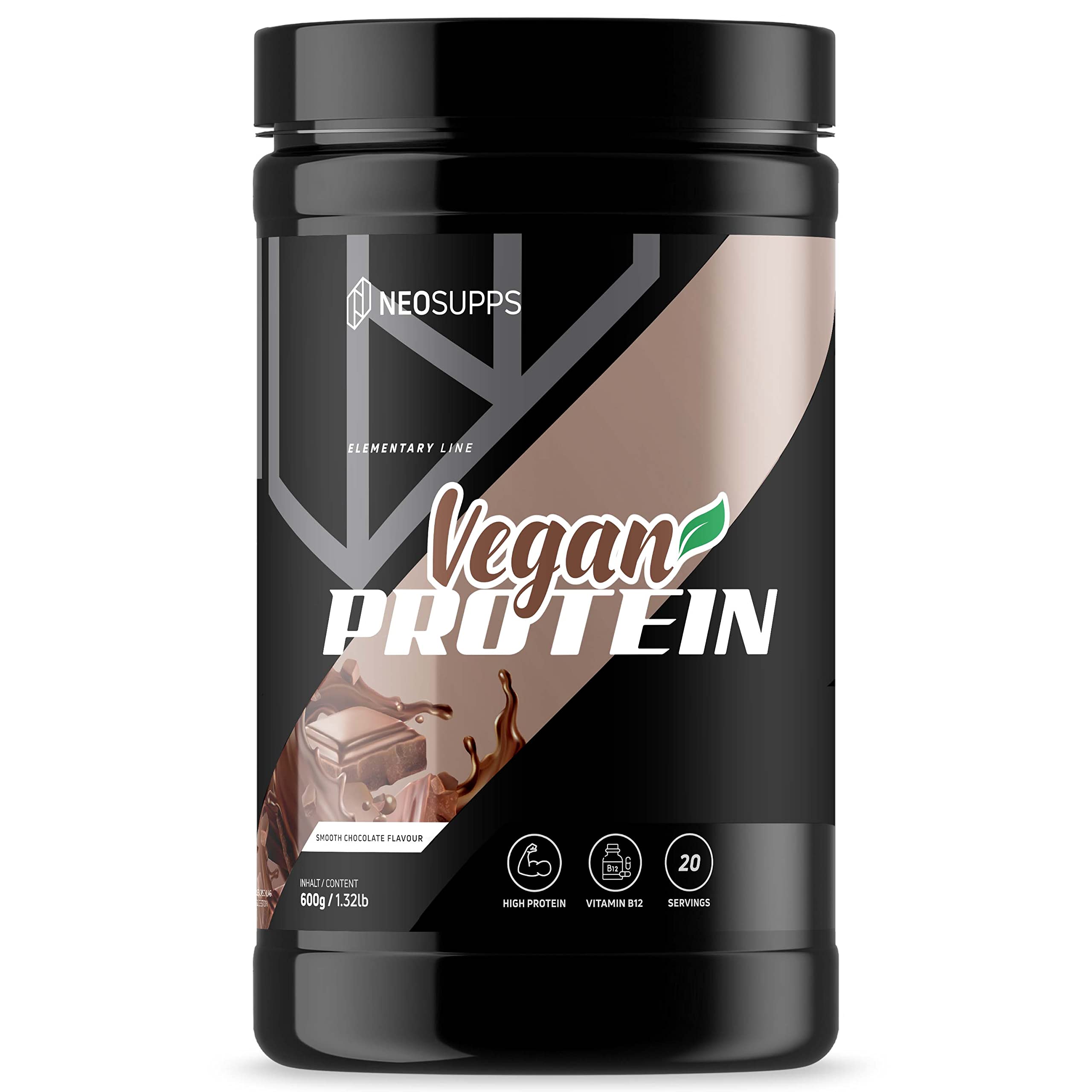 Vegan Power Made by Neosupps You eat vegan and are you looking for a suitable protein supply that not only fits your lifestyle, but also tastes super tastyThen we have the ideal solution for you!Our vegan protein provides you with 20-22g protein per portion and spoils your sense of taste with the full-bodied varieties ""Smooth Chocolate "" Banana Caramel ""In addition, our new product highlight with vitamin B12! The vitamin B12 hardly occurs in vegetable foods and therefore has tocan be supplemented in a vegan diet to avoid deficiency, weakness, anemia and nerve disorders. Ingredients ingredients Pea protein 77 , rice protein 9.0 , aroma, pumpkin seed protein 4.5 , salt, sweeteners (sucralose, stevioglycosides), cyanocobalamine.Can contain traces of gluten, egg, milk, nuts and soy.develops with 3 in Hamburg: The Neosupps team around Flying Uwe has been developing unique supplements for real athletes and those who want to become one for many years.Delicious easy to solve: Our vegan protein offers excellent solubility and is perfect as a protein shake vegan.Enjoy 20 portions of delicious, healthy and vegan protein.Vitamin B12-Anlichert: Our Neosupps protein powder vegan is enriched with vitamin B12 and covers 50 of your daily requirement to support your healthy vegan diet.Hardly sugar: With 20-22g protein per portion and almost no sugar (0.2g per portion), our vegan protein powder is ideal for your protein-rich, low-sugar nutrition plan.High quality vegan protein: Our vegan whey protein, made in Germany, combines three first -class protein components (pea protein, travel protein and pumpkin seed protein) for a complete amino acid profile and optimal results.VEGAN POWER MADE BY NEOSUPPS Du ernährst dich vegan und bist auf der Suche nach einer geeigneten Proteinversorgung, die nicht nur zu deinem Lebensstil passt, sondern auch super lecker schmecktDann haben wir die ideale Lösung für dich! Unser Vegan Protein liefert dir 20-22g Protein pro Portion und verwöhnt deinen Geschmackssinn mit den vollmundigen Sorten ""Smooth Chocolate ""Banana Caramel"" Darüber hinaus versorgt dich unser neues Produkthighlight mit Vitamin B12! Das Vitamin B12 kommt in pflanzlichen Lebensmitteln kaum vor und muss daher bei einer veganen Ernährung supplementiert werden, um Mangelerscheinungen wie Müdigkeit, Schwäche, Blutarmut und Nervenstörungen zu vermeiden. Eine Portion unseres Vegan Protein deckt zu 50 deinen Tagesbedarf an Vitamin B12 ab. INHALTSSTOFFE ZUTATEN Erbsenprotein 77 , Reisprotein 9,0 , Aroma, Kürbiskernprotein 4,5 , Salz, Süßungsmittel (Sucralose, Stevioglycoside), Cyanocobalamin. Kann Spuren von Gluten, Ei, Milch, Nüssen und Soja enthalten.ENTWICKELT MIT 3 in HAMBURG: Das NEOSUPPS Team rund um Flying Uwe entwickelt seit vielen Jahren einzigartige Supplements für echte Sportler und die, die es werden wollen. LECKER LEICHT LÖSLICH: Unser vegan Protein bietet eine hervorragende Löslichkeit und eignet sich perfekt als Proteinshake vegan. Genieße 20 Portionen köstliches, gesundes und veganes Protein. VITAMIN B12-ANGEREICHERT: Unser Neosupps Proteinpulver vegan ist mit Vitamin B12 angereichert und deckt 50 deines Tagesbedarfs ab, um deine gesunde vegane Ernährung zu unterstützen. KAUM ZUCKER: Mit 20-22g Protein pro Portion und nahezu keinem Zucker (0,2g pro Portion) ist unser vegan Protein Pulver ideal für deinen proteinreichen, zuckerarmen Ernährungsplan. HOCHWERTIGES VEGANES PROTEIN: Unser veganes Whey Protein, hergestellt in Deutschland, kombiniert drei erstklassige Eiweißkomponenten (Erbsenprotein, Reisprotein und Kürbiskernprotein) für ein vollständiges Aminosäurenprofil und optimale Ergebnisse.NEOSUPPS Vegan Protein Pulver - Smooth Chocolate, 600g I Hochwertiges veganes Proteinpulver aus Erbsenprotein, Reisprotein Kürbiskernprotein I Angereichert mit Vitamin B12 zuckerarm Karamell