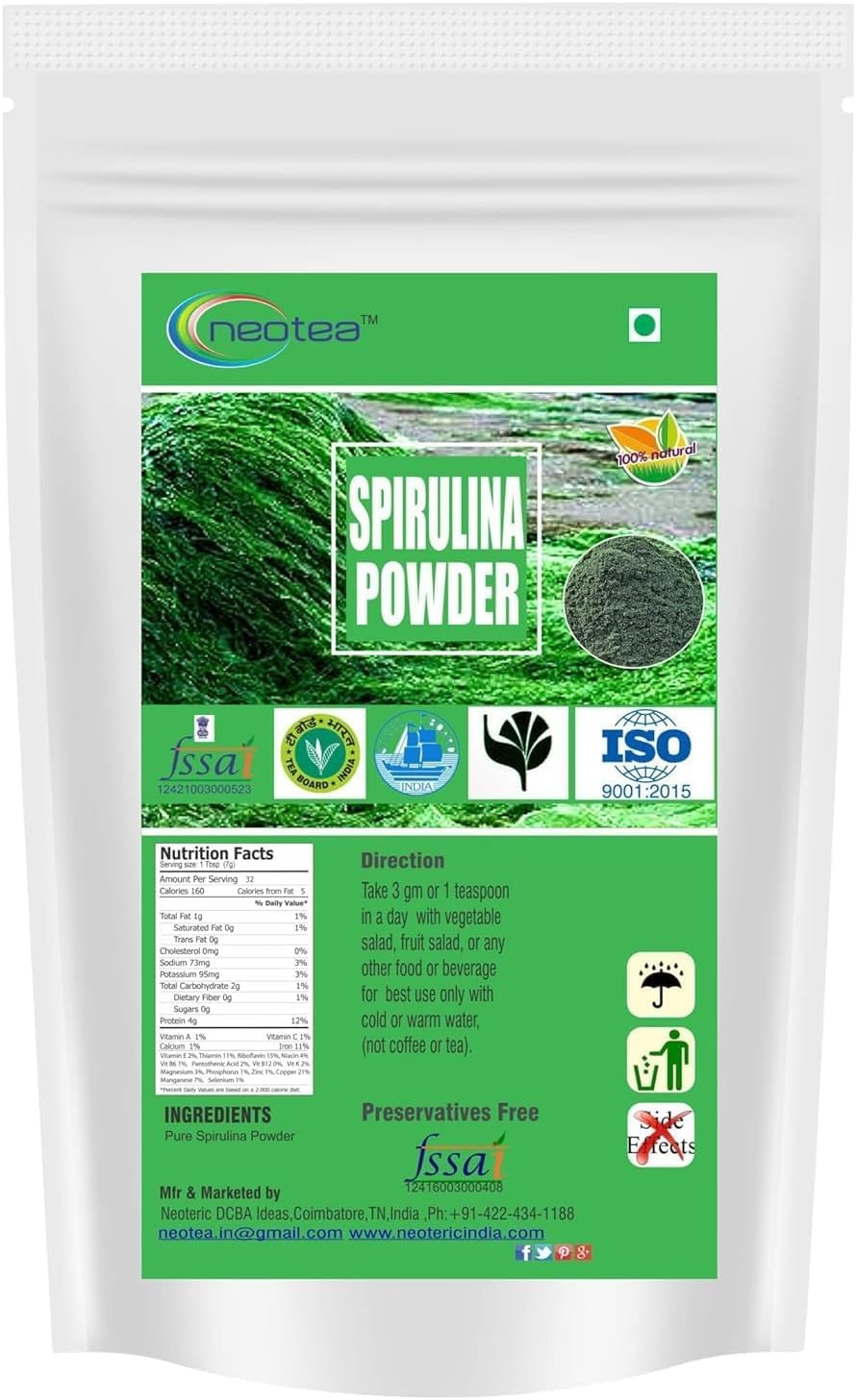 ✓ High-Quality Spirulina – Carefully sourced and tested for quality. Naturally contains small traces of lead as found in all natural spirulina products. Customer satisfaction guaranteed. Convenient Pack – Comes in a secure, pouch to preserve freshness and allow for easy scooping and storage. Easy to Mix Blend – Blends smoothly into smoothies, juices, salad dressings, and baked goods for a quick nutritional boost. Rich in Protein Nutrients – Naturally packed with plant-based protein, essential amino acids, iron, and antioxidants to support overall wellness. Organic Non-GMO Superfood – FSSAI-certified organic spirulina powder made from nutrient-rich blue-green algae a clean, plant-based addition to your diet.