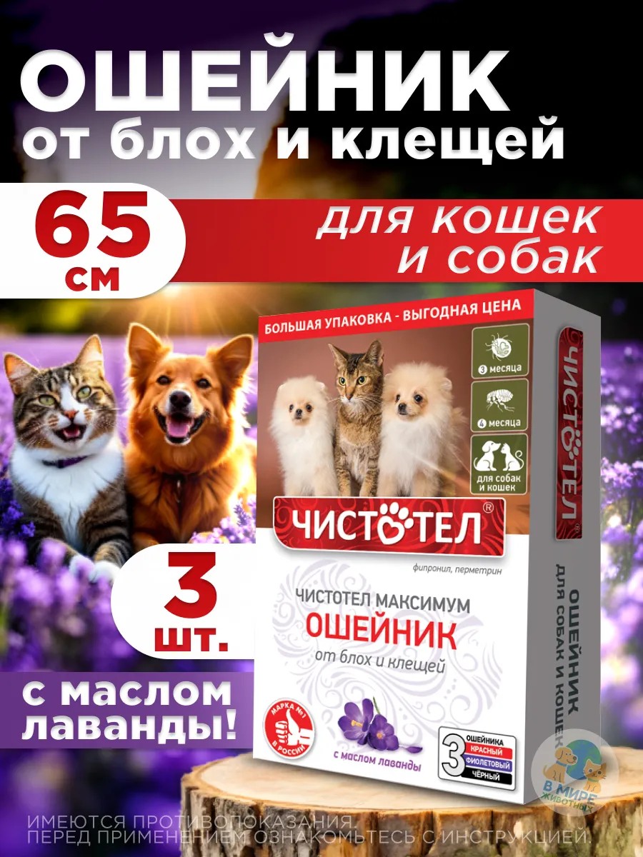 Ошейники «Чистотел Максимум» — надёжная защита от блох и клещей для ваших питомцев! В упаковке вы найдёте сразу три ошейника разных цветов: красного, чёрного и фиолетового. Они подходят как для собак, так и для кошек, а благодаря водостойкости сохраняют свои свойства даже после контакта с водой. Обеспечьте своему любимцу комфорт и спокойствие с ошейниками «Чистотел Максимум»!