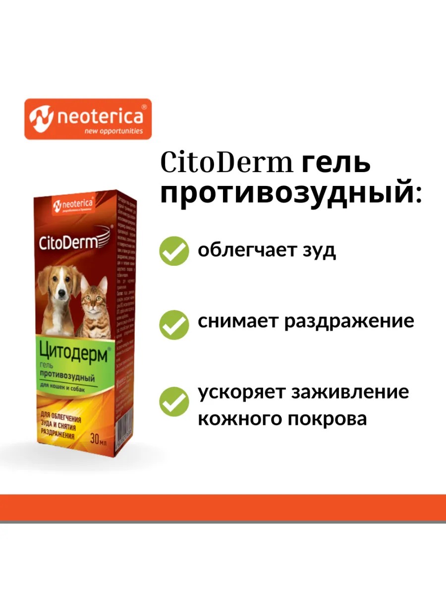 | Полное наименование товара | Цитодерм гель противозудный для кошек и собак 30 мл |