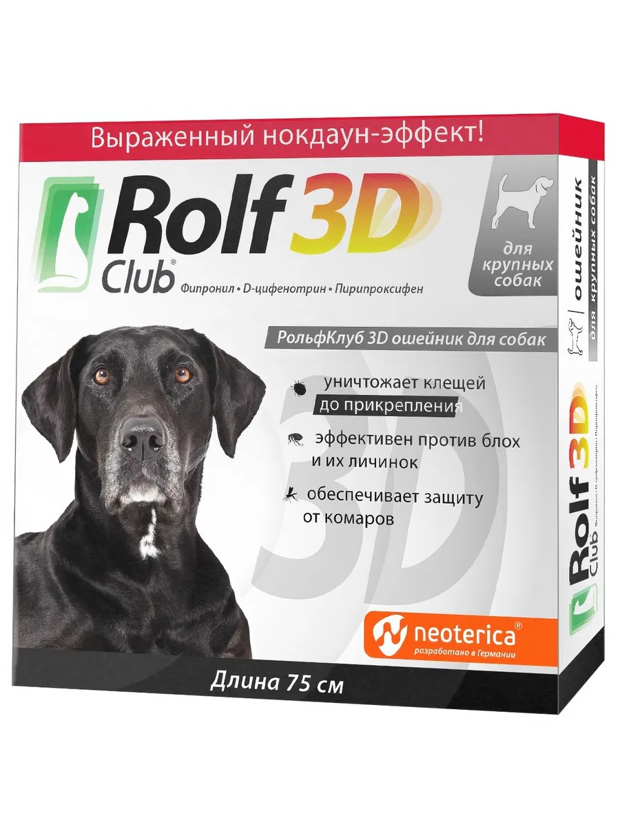 RolfClub 3D (Neoterica) ошейник для собак крупных пород, от блох и клещей, 75 см. Мы знаем паразиты опасны для наших животных: они вызывают и переносят болезни, нередко смертельно опасные. Многие ветеринарные препараты убивают клещей только после укуса. Это дополнительные риски для здоровья. Не рискуйте здоровьем питомца. Используйте препараты RolfClub 3D. RolfClub 3D имеет три мощных уровня защиты: 1. Нокдаун-эффект парализует клеща ДО укуса Уже через 2 минуты клещ не может передвигаться и выбирать место для укуса. Эффект обеспечивает действующее вещество последнего поколения D-цифенотрин. 2. Уничтожение клещей, блох, вшей, власоедов и др. Действующее вещество фипронил убивает существующих насекомых и клещей, обеспечивает длительную защиту. 3. Защита от повторного заражения насекомыми Действующее вещество пирипроксифен прерывает цикл развития блох (и других насекомых), защищает животное и помещение от повторного заражения. RolfClub 3D Ошейник для крупных собак защищиает надолго! 6 месяцев защиты от: ? Иксодовых клещей (переносят пироплазмоз и др. болезни) ? Блох, вшей, власоедов 5 дней защиты от: ? комаров, мошек и москитов Используйте ошейник RolfClub 3D для крупных собак старше 3 месяцев. Это удобный способ защиты: ? Без запаха ? Водостойкий Длина ошейника 75 см, цвет серый. Действующие вещества: фипронил 5%, D-цифенотрин 5%, пирипроксифен 2%